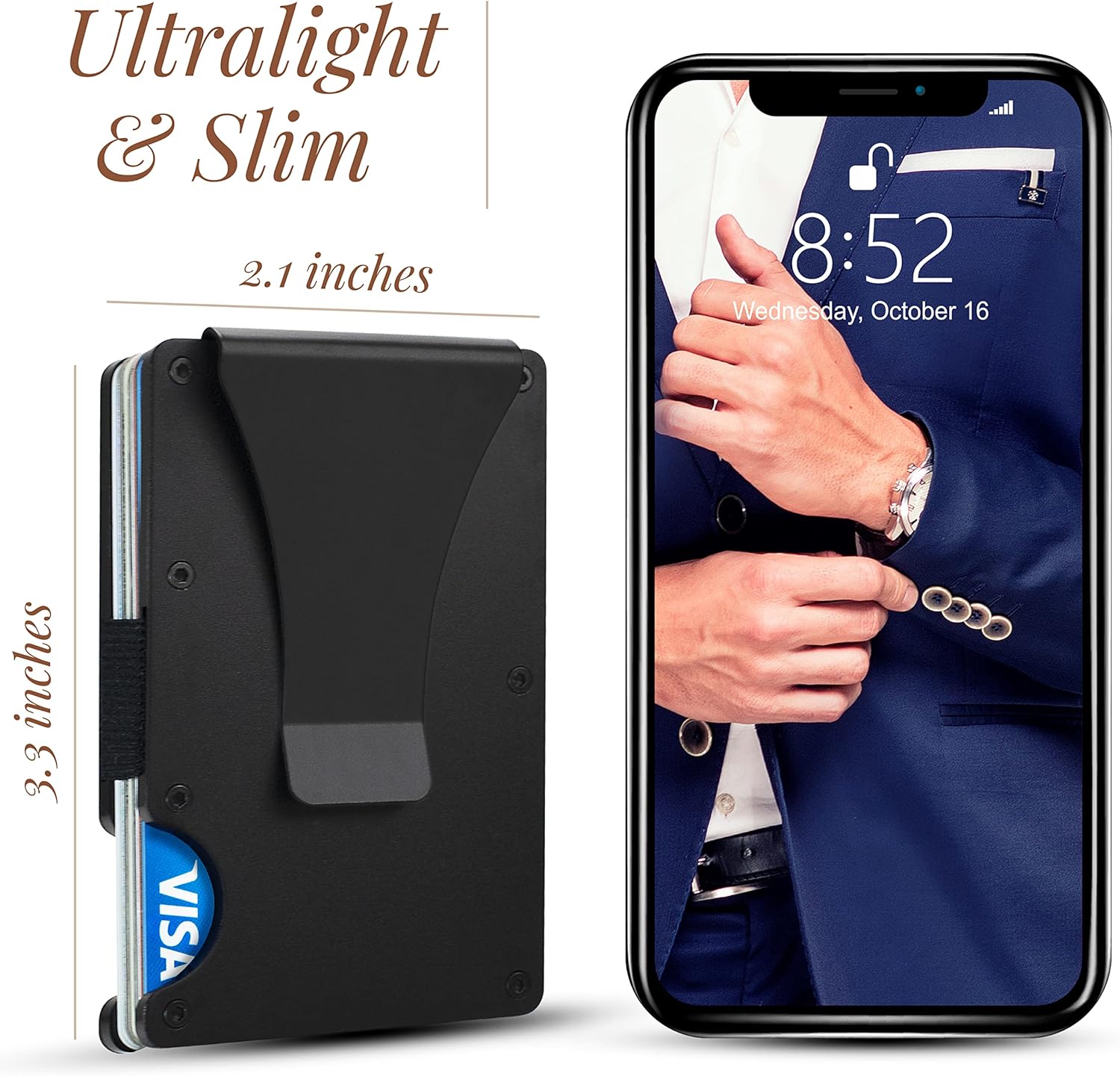 - DURABLE & RFID BLOCKING: Our metal slim wallet is made from durable aluminum material, which makes it RFID blocking wallet. The dimensions of the wallet are 3.3 inches in length and 2.1 inches in width. It can hold up to 15 credit cards, and its money clip fits up to 10 bills of cash with ease.