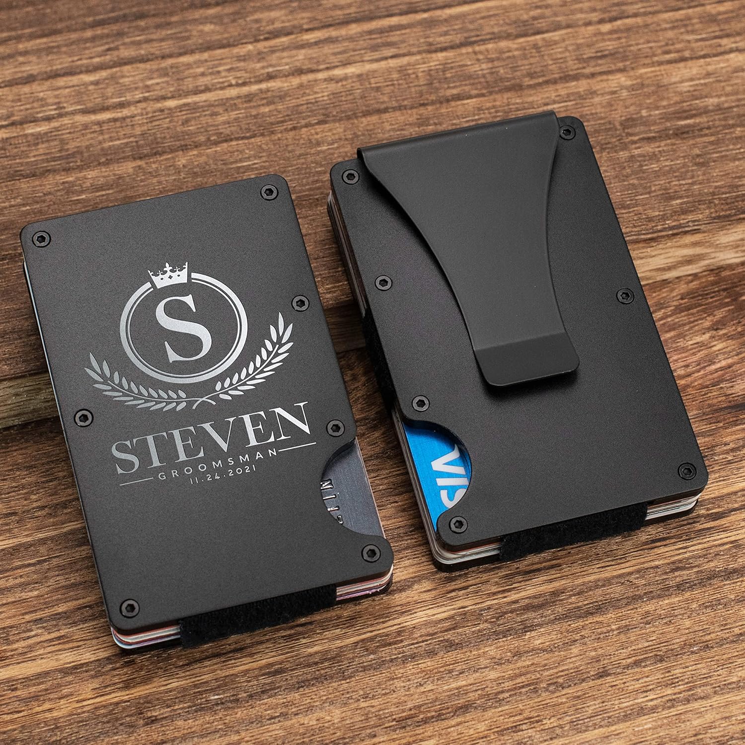 - UNIQUE GROOMSMEN GIFT FOR MEN: We present you with our elegantly personalized metal card holder wallet, a great gift idea for a groomsman proposal, customized with an initial, a name, a title, and a date of your choice. Best wedding gift for a groom, groomsmen, best man, father of the bride, or your wedding usher.