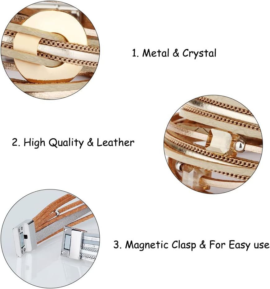 Fesciory Leather Wrap Bracelets for Women, Boho Leopard Multi-Layer Crystal Beads Cuff Bracelet Jewelry
