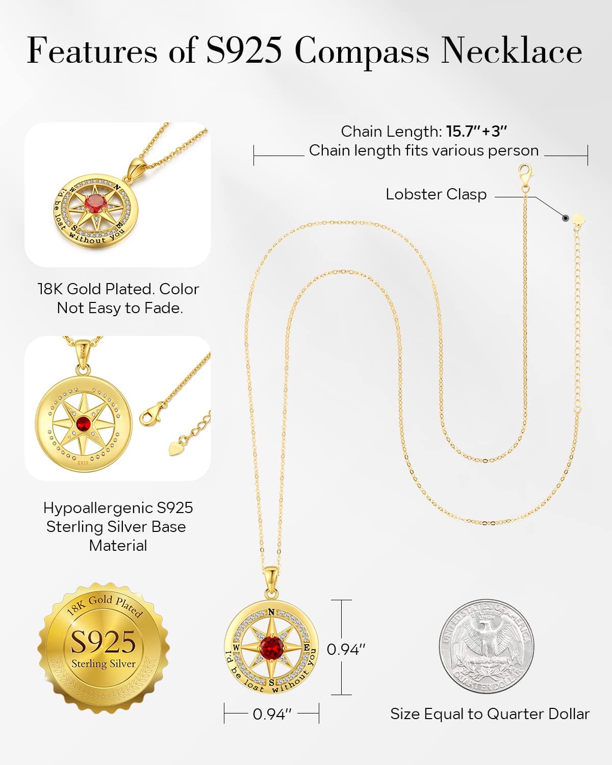 S925 Necklace Gift for Wife |Compass Jewelry |Women Anniversary |Sterling Silver |Girlfriend Birthday Gifts for Her Valentines |I'd be Lost without You |Jewel 18K Gold