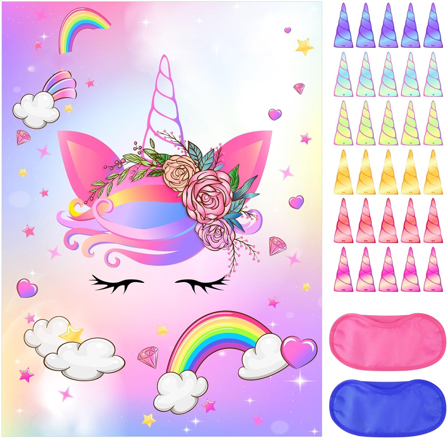 NEBURORA Pin The Horn on The Unicorn with 30 PCS Horns Birthday Party Supplies for Girls Birthday Christmas Party Game for Kids