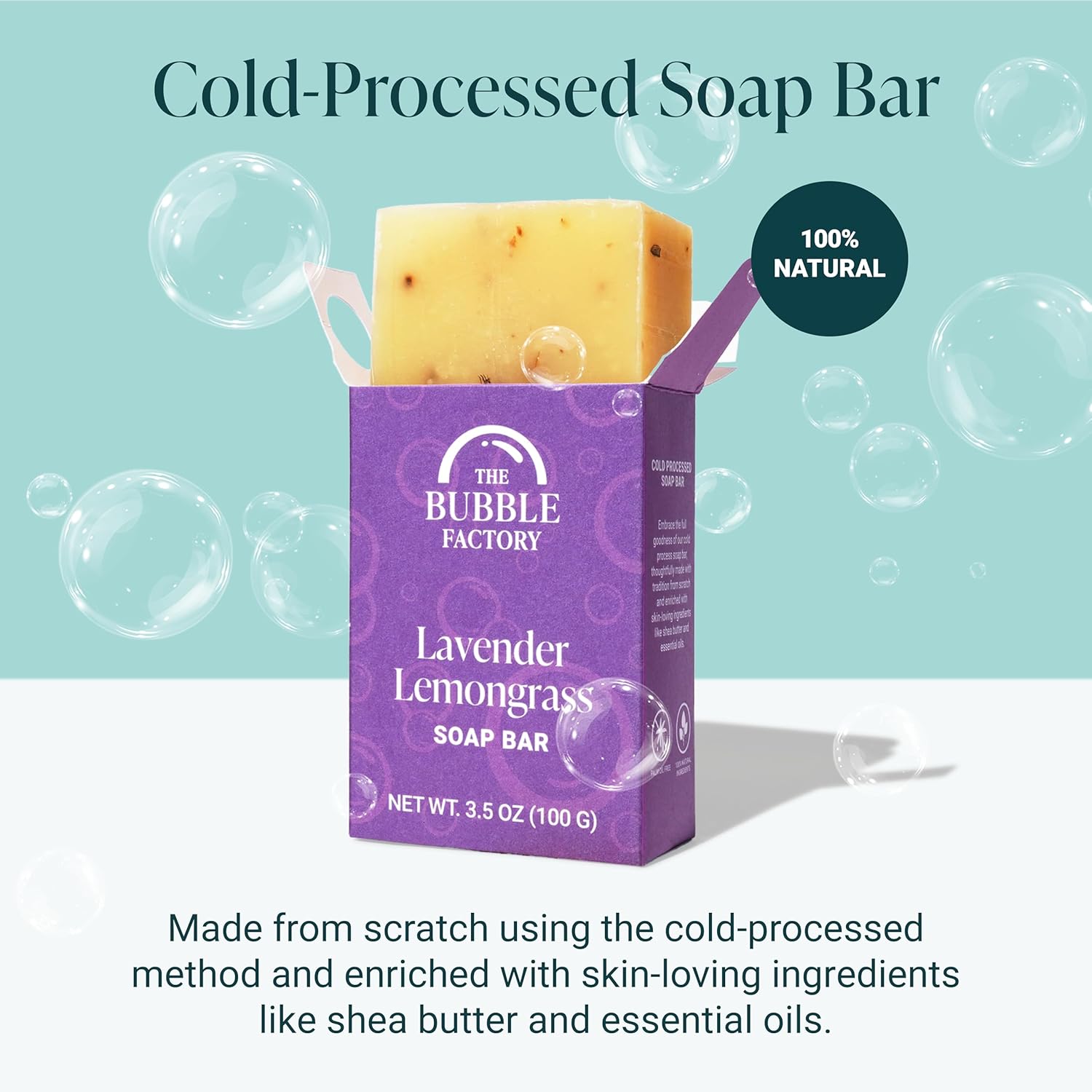 - PALM OIL FREE: The Bubble Factory bar soap is crafted in a Cosmetic GMP Certified facility with natural ingredients. Free from harsh chemicals like SLS, phthalates, and parabens. Palm oil free, vegan, cruelty-free, detergent free, chemical free, non-toxic, and gluten-free soap that is 97% naturally derived (even for the most sensitive of skin). Each moisturizing bar can last up to 4 weeks with proper drying care and moderate consistent daily use