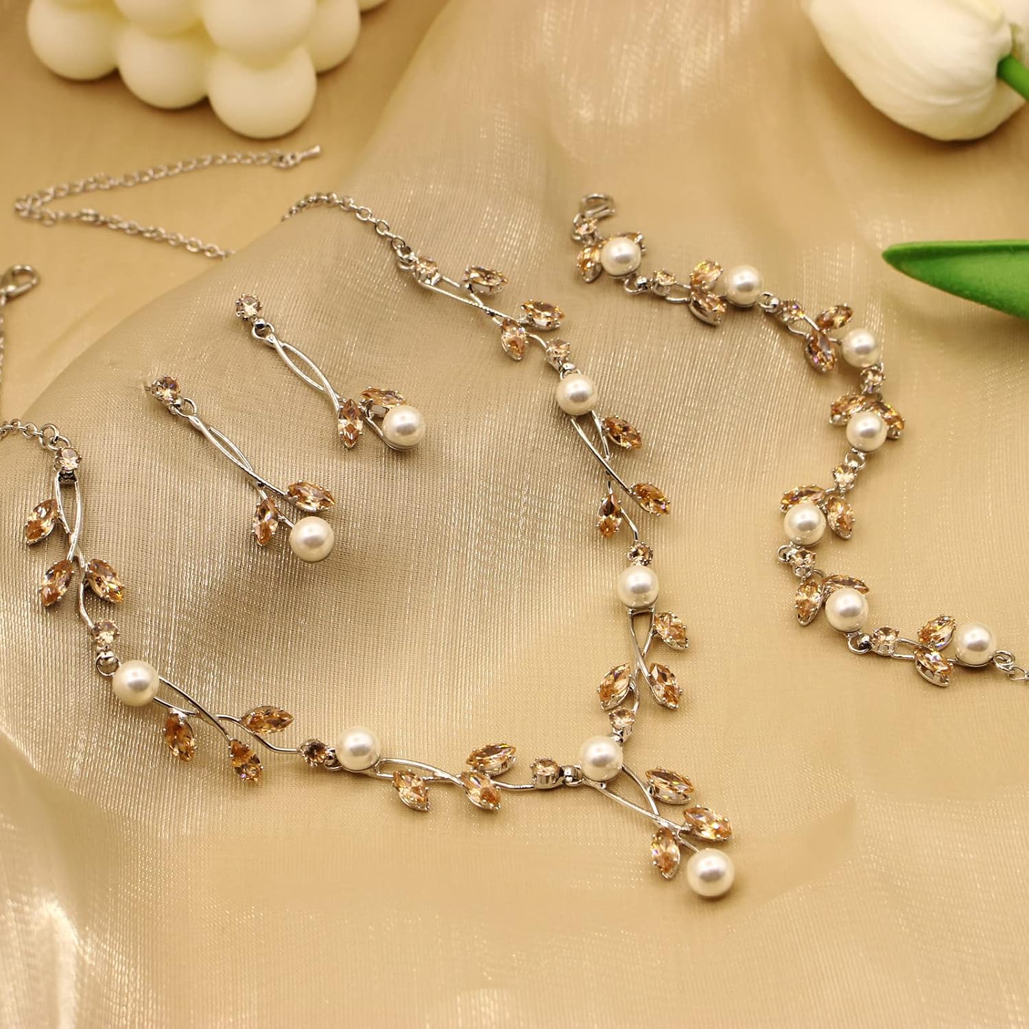 Luxury Cubic Zirconia Aurtrian Crystal Pearl Floral Necklace Dangle Earrings Wedding Bridal Jewelry Set Birthday Gifts for Her
