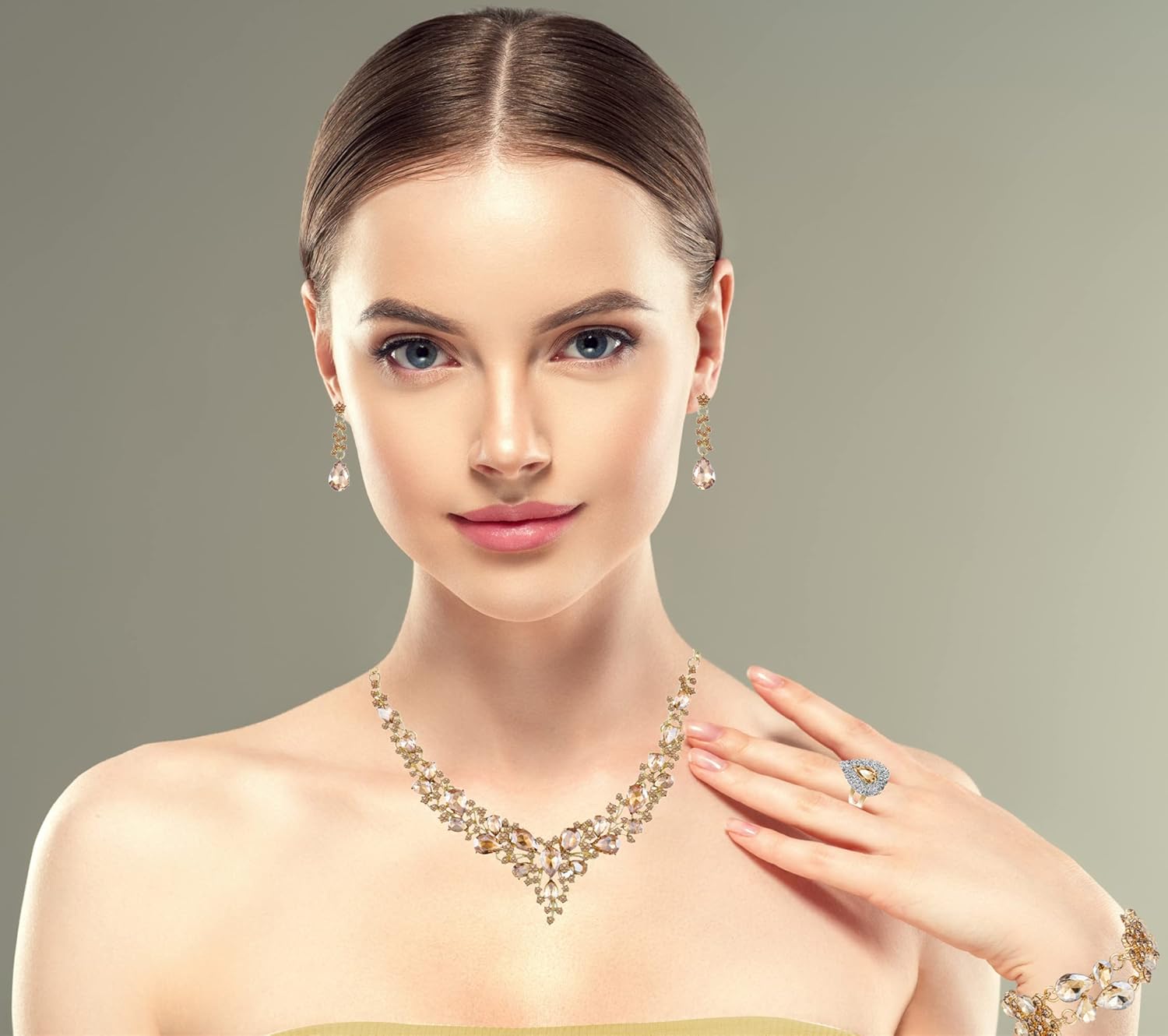 - Specification: Brand Name: Paxuan. Material: Silver / Gold Plated Zinc Alloy(environmental friendly and hypoallergenic) + Austrian Crystal. Size: Necklace: 16'' + 2'' Extension. Earrings: 2.5'' in length, 0.7'' in width. Bracelet: 6'' + 3.2'' Extension. Ring: Adjustable. Weight: 90g/set (Perfect weight, comfortable to wear). Color: Gold plated champagne crystal.