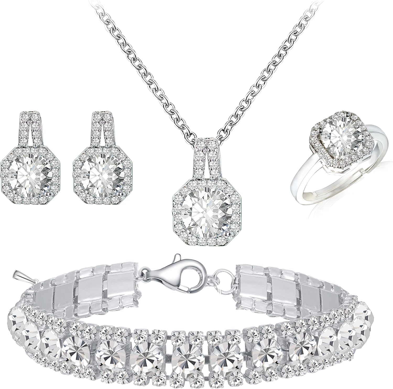 4pcs Cubic Zirconia Wedding Jewelry Sets for Bride Bridesmaid Cubic Zirconia Pendant Necklace Earrings Link Tennis Bracelet Open Ring Set for Women