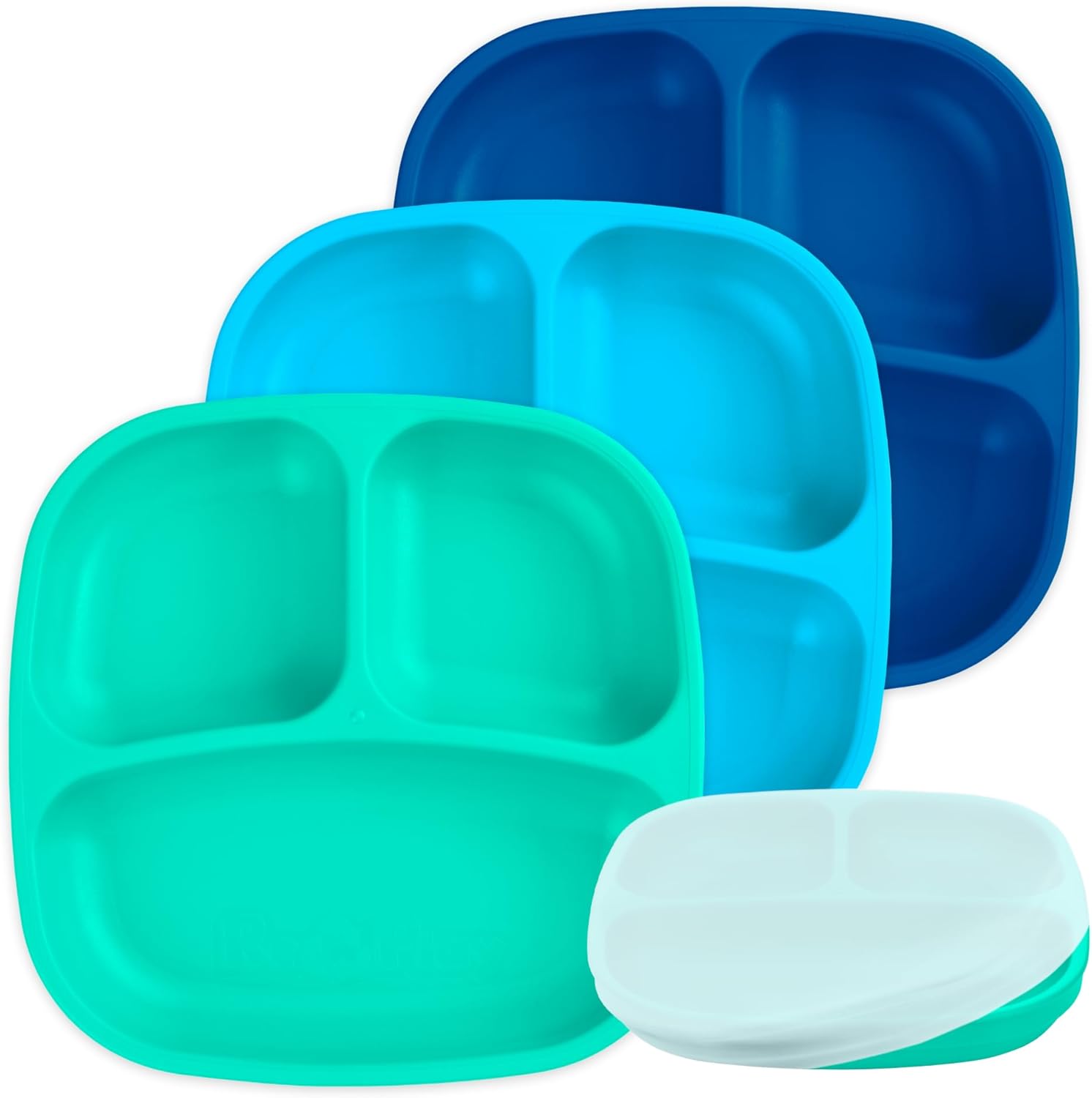 Re-Play Toddler Plates with Dividers - Deep-Walled 3 Compartments Divided Plates for Kids with 1 Lid - Dishwasher & Microwave Safe - Made in USA - Set of 3-7.37" x 7.37" x 1.25