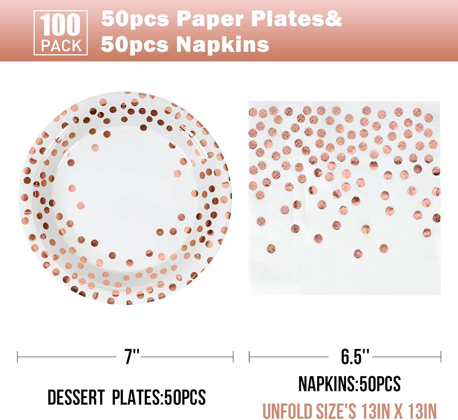 Disposable Paper Plates 100 Pack-White and Rose Gold Plates 50x7&Rose Gold Dot Napkins 50x6.5,Paper Plate and Napkins Party Supplies for Birthdays,All Occasions