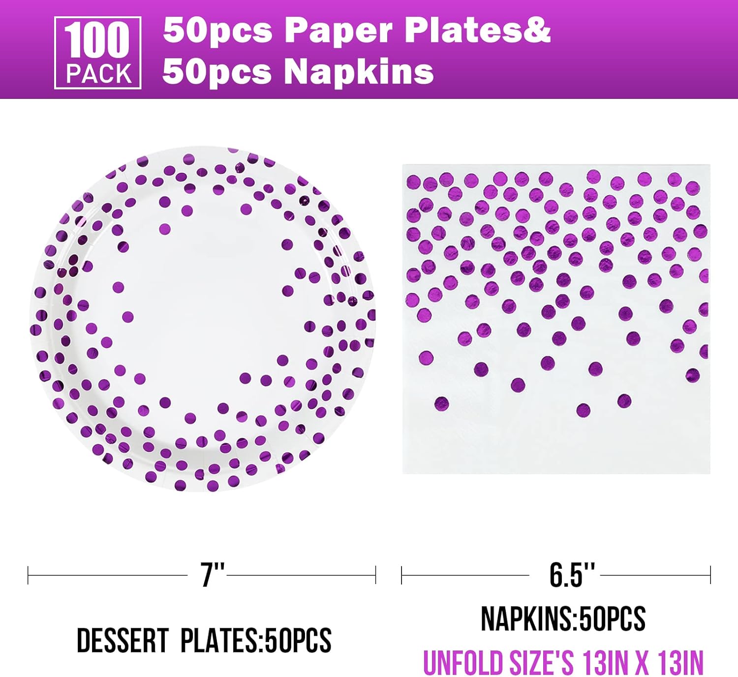 White and Purple Gold Paper Plates- 100 Pack- 50 x 7" Paper Plates & 50 x 6.5" Napkins, Purple Plate and Napkins Party Supplies for Birthdays Receptions and All Occasions