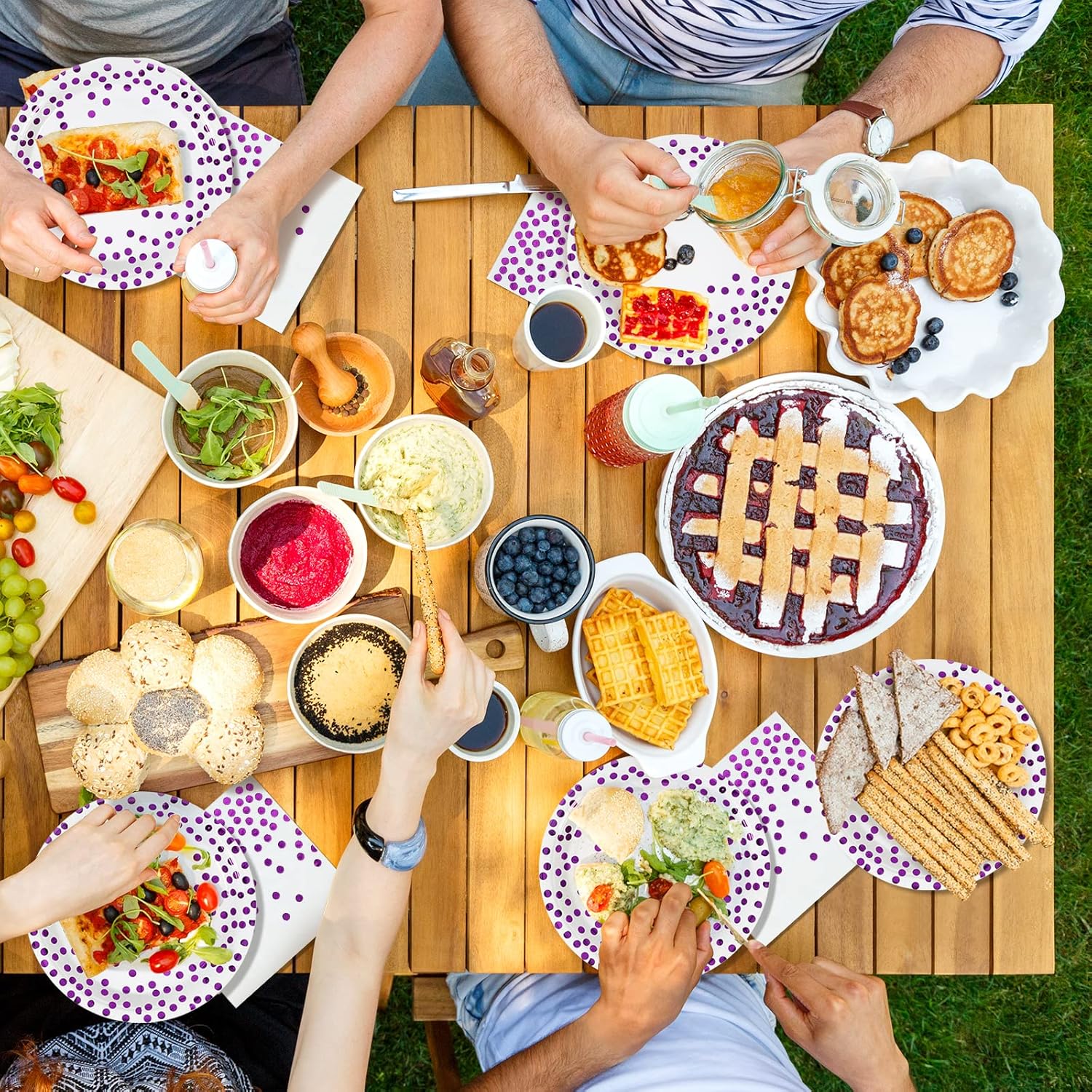 - 4.Safe Material: The paper plates are made of 350gsm thickened paper that is impermeable. The material is safe and non-toxic, BPA-free and biodegradable. The napkins are made with food-grade water-based ink, which is not only absorbent, but also non-toxic, non-hazardous and skin-friendly