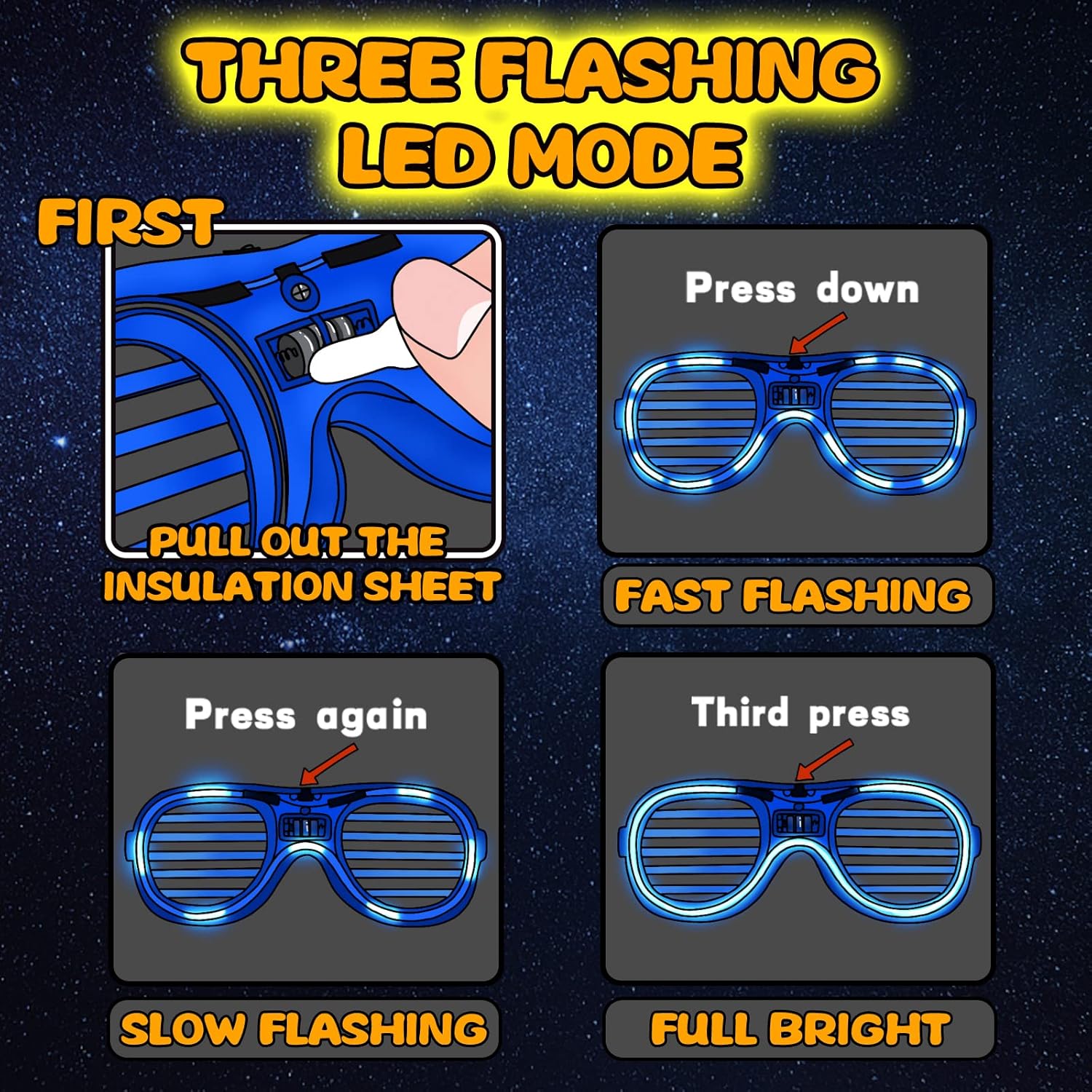 - Glow Party Supplies: 100 pairs of LED shutter shades glasses in 5 different color(red, blue, pink, green and white), 20 for each color. These light up glasses are abundant and colorful for 80’s parties.