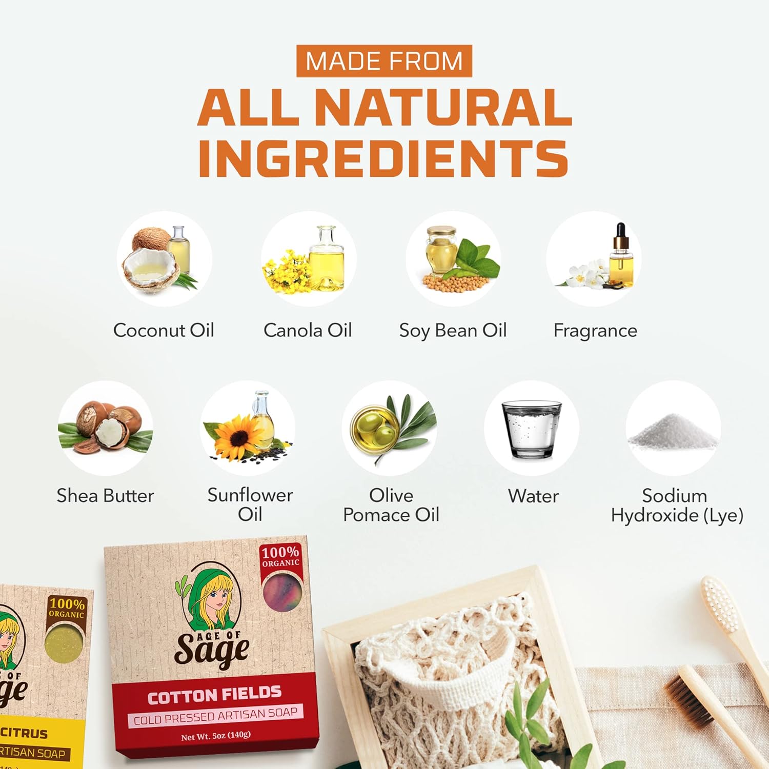 - COLD PRESSED ARTISAN SOAP: Stay fresh and find pleasure with our Peach Tea, Tropical Citrus, Cotton Fields, and Grapefruit Tea Tree scented Cold Pressed Artisan Soaps. We employ the cold process soap-making method mixed by hand in small batches to ensure the quality of the product