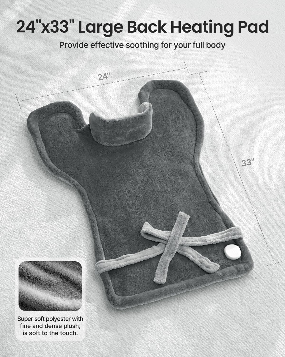 - Extra Large Size: The heating pad for back pain relife measures 24"x33", which can wrap your entire back, waist, neck and shoulders, can also be flexibly applied to the arms, abdomen, legs, and more. Weighted edges help the heat pad drape naturally and neck snap fasteners keep the electric heating pad in place so you can move freely.