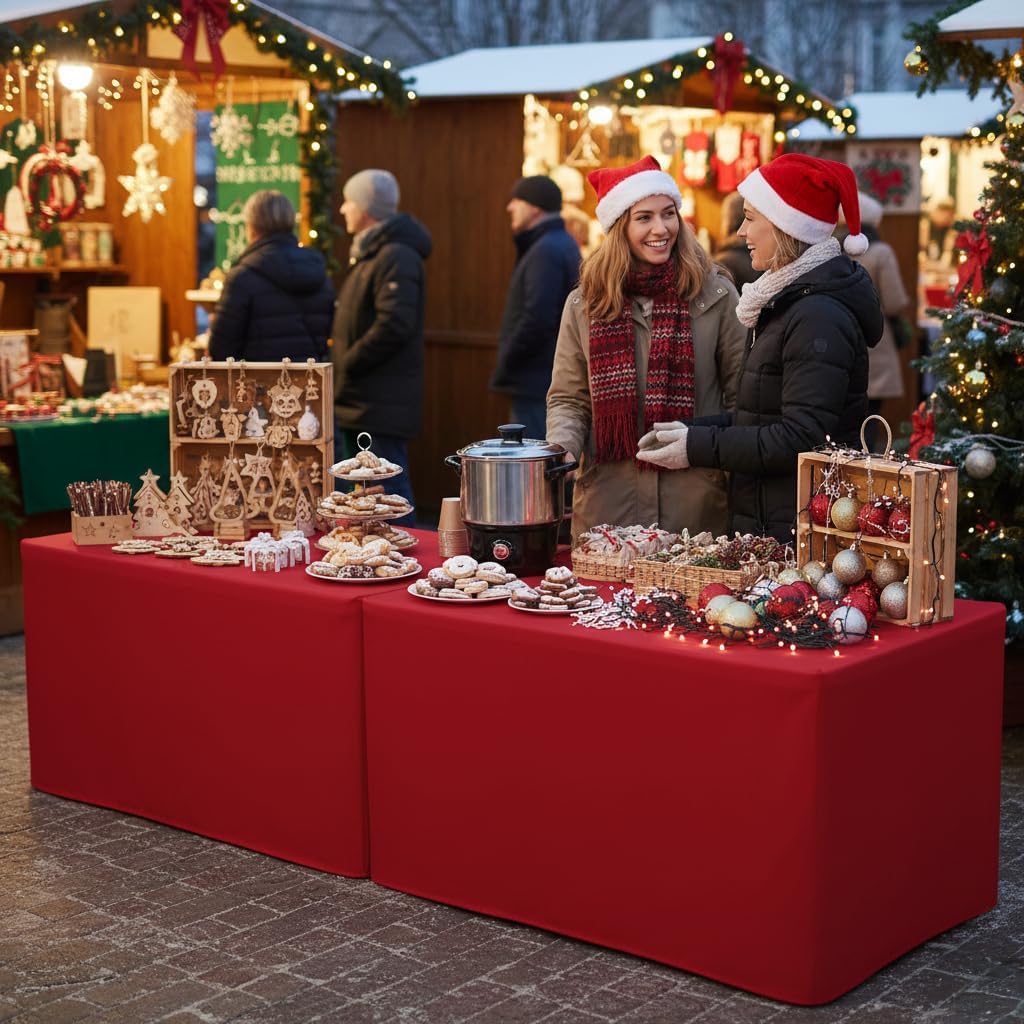 HolidayIdeas 2 Pack Red Fitted Tablecloth for 4ft Tables, 4-Sided Christmas Table Cover for Holiday Markets, Yard Parties, & Gift Tables, Wrinkle-Resistant Washable Xmas Decorations