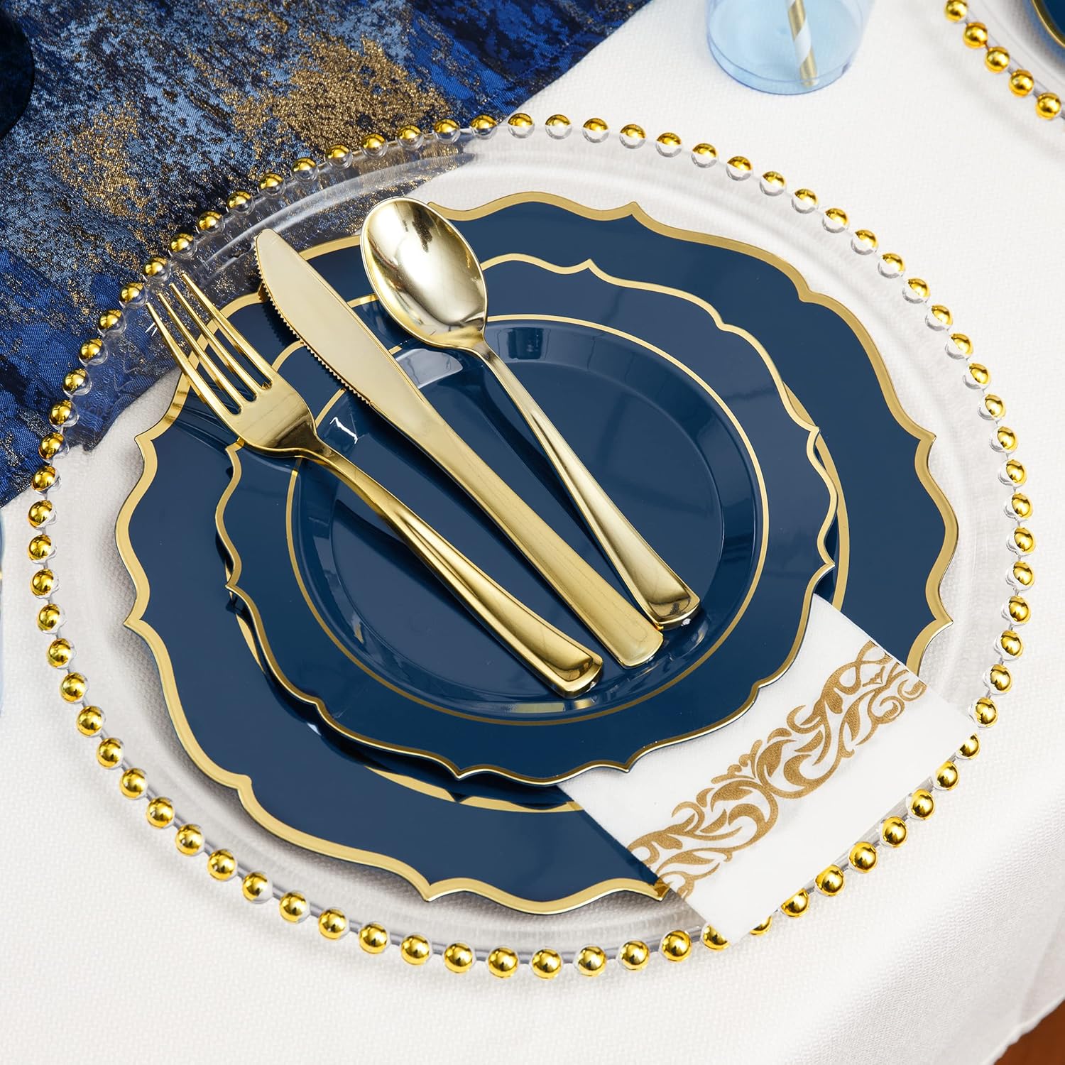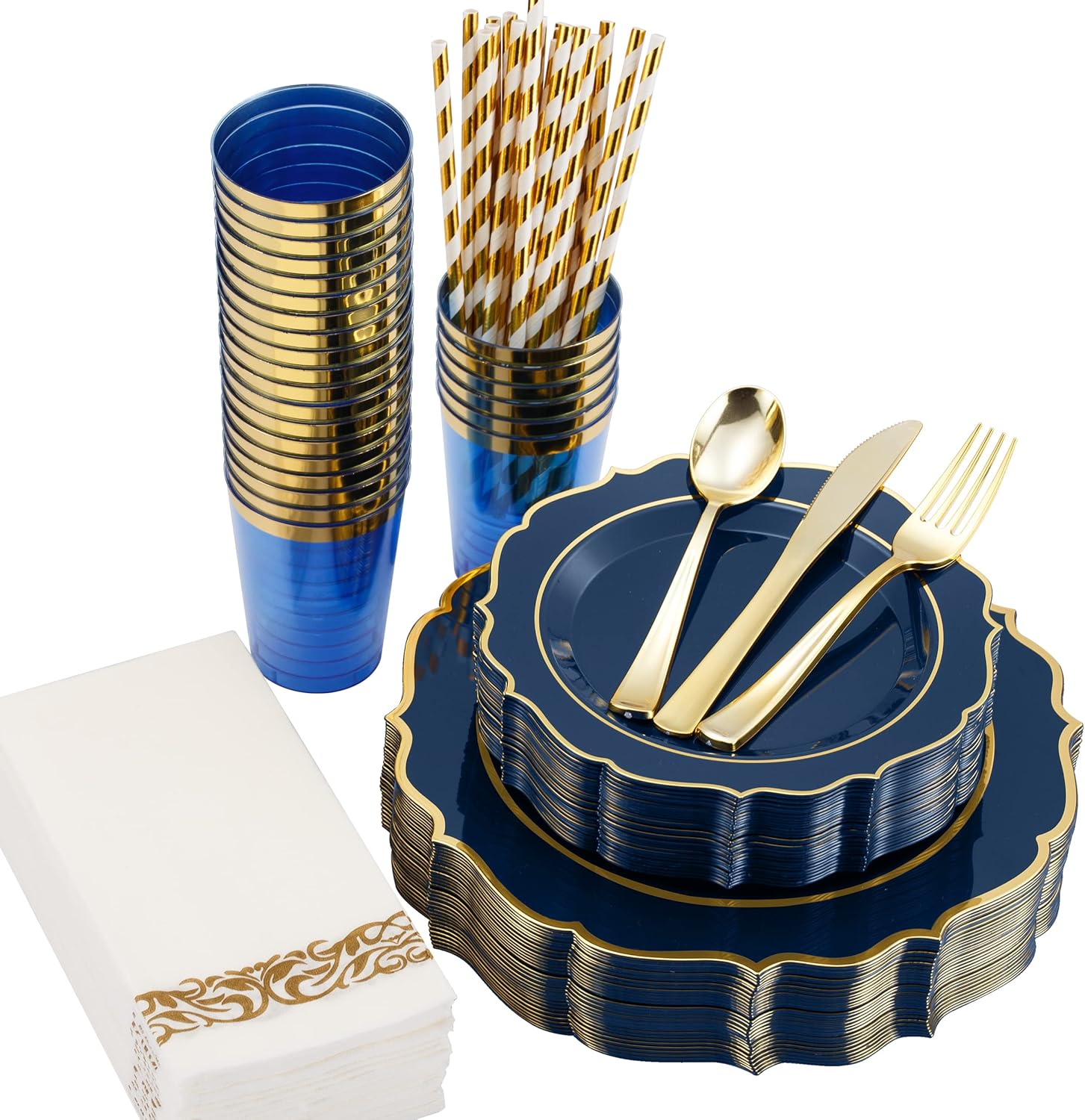 - COMPLETE TABLEWARE SET: One for all needs!This disposable navy blue plastic dinnerware set includes a total of 200 pieces of flatware. You will receive 25 disposable plastic dinner plates, 25 dessert plates, 25 forks, 25 knives, 25 spoons, 25 cups, 25 napkins and 25 paper straws, allowing you to effortlessly host parties, weddings, and other events for up to 25 guests while meeting all of your dining needs.