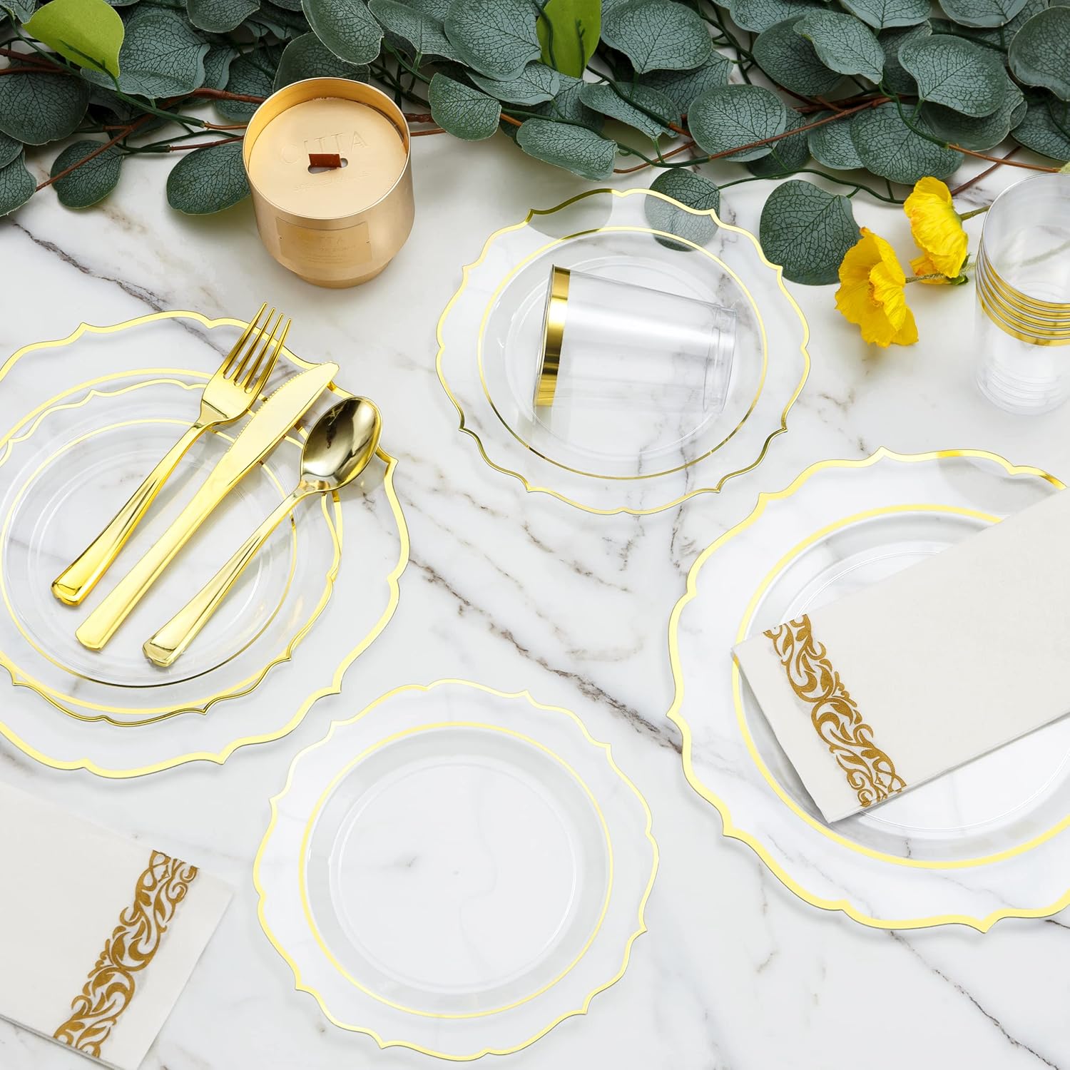 - COMPLETE TABLEWARE SET: One for all needs!This disposable clear gold plastic dinnerware set includes a total of 200 pieces of flatware. You will receive 25 disposable plastic dinner plates, 25 dessert plates, 25 forks, 25 knives, 25 spoons, 25 cups, 25 napkins and 25 paper straws, allowing you to effortlessly host parties, weddings, and other events for up to 25 guests while meeting all of your dining needs.