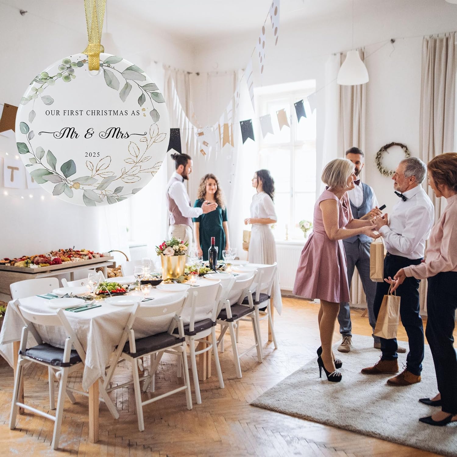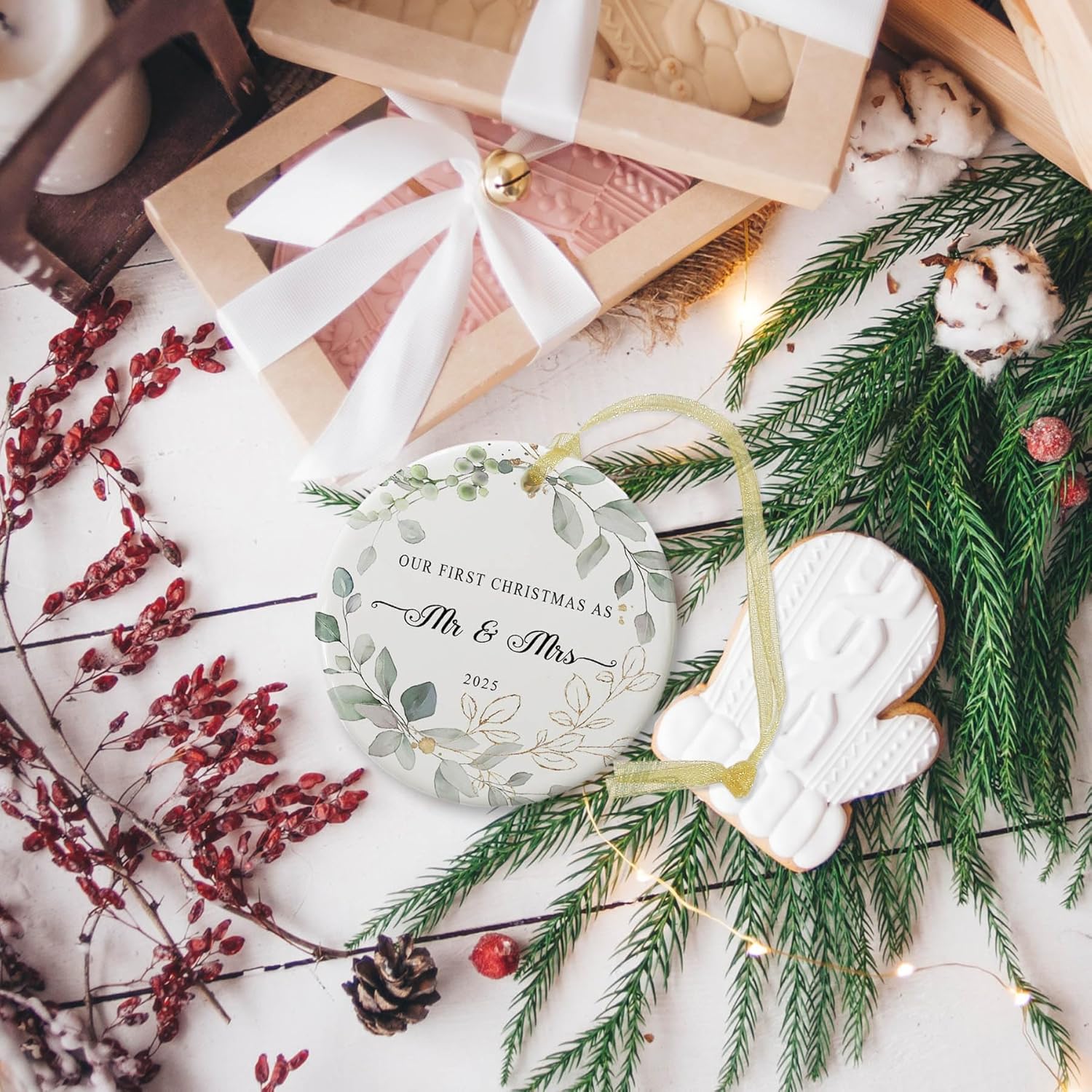 Our First Christmas Married Ornament 2025,Wedding Gifts for Couples Unique Decoration,First Year Newlywed Mr and Mrs Hanging 2.9" Ceramic Round Ornament