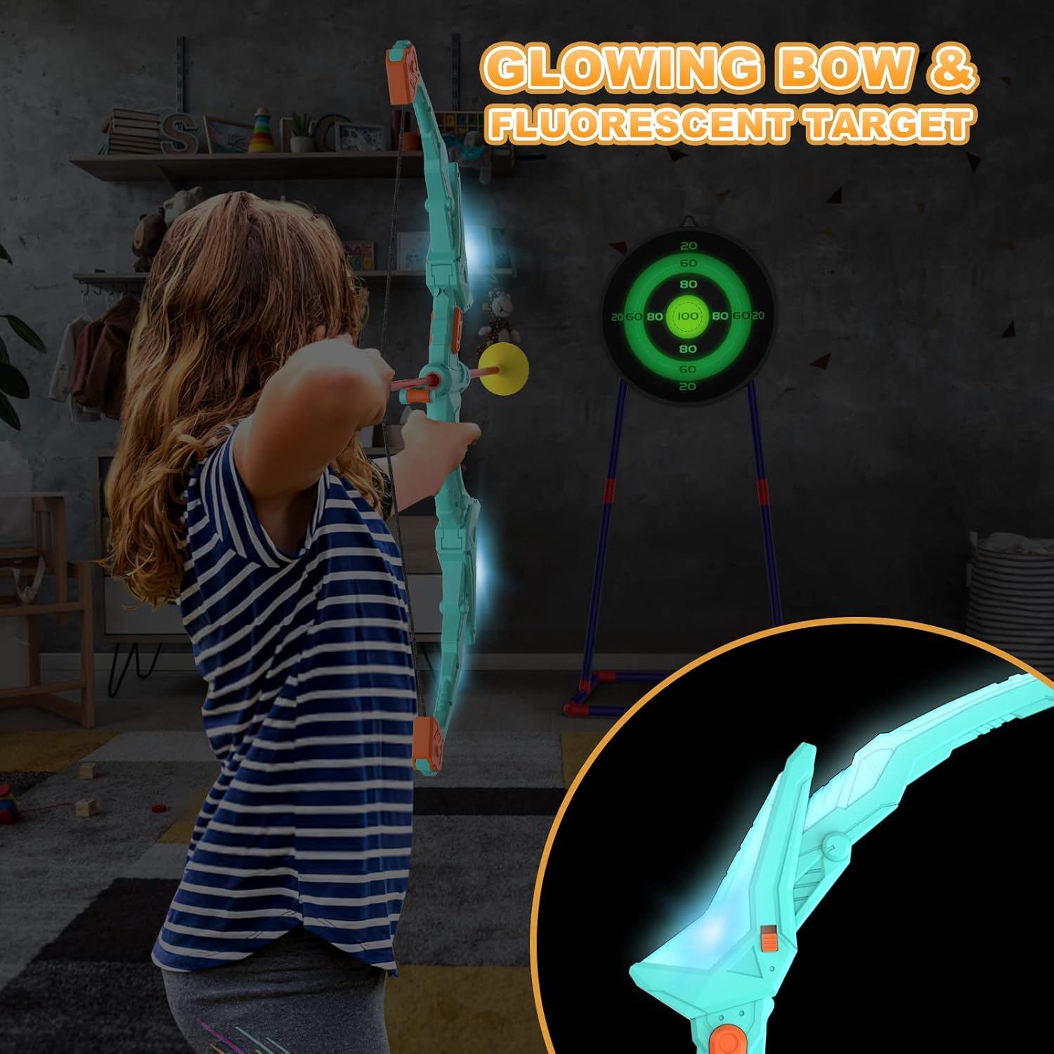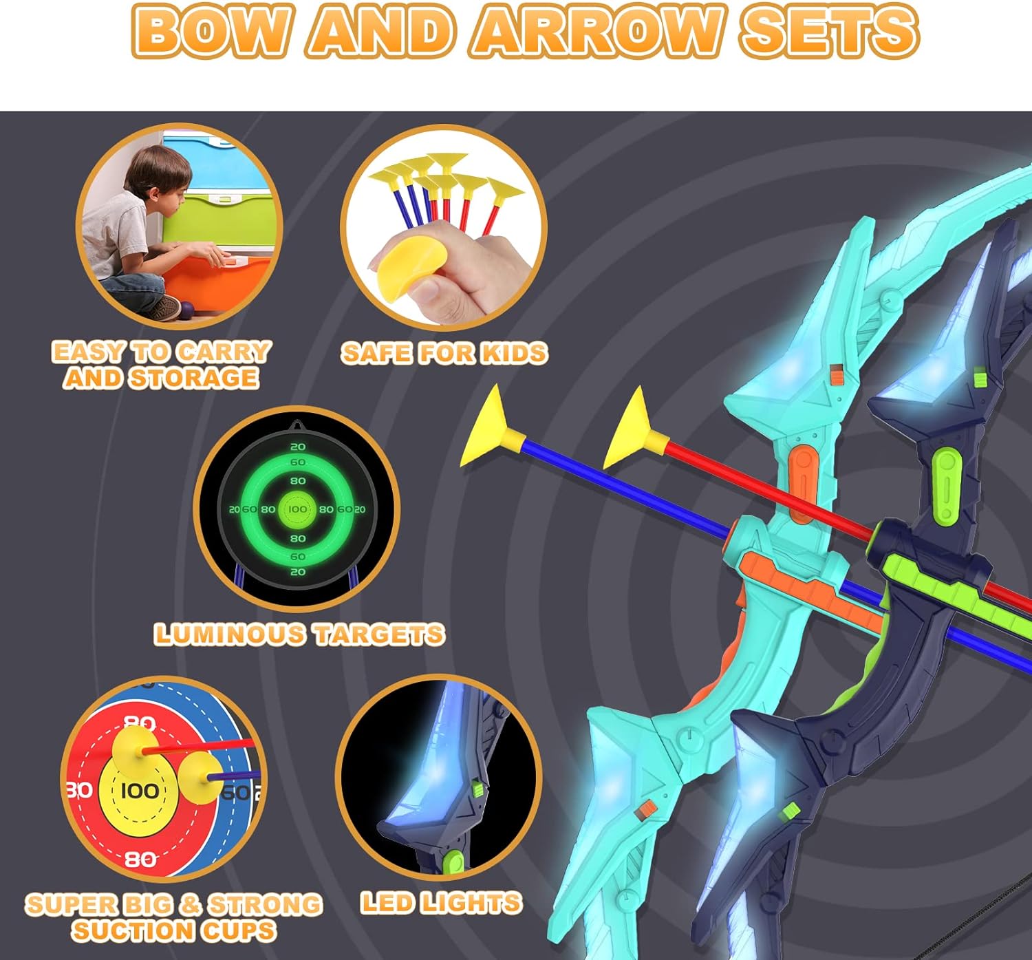 2 Pack Kids Bow and Arrow Set with LED Flash Lights, 14 Suction Cup Arrows and Fluorescence Standing Target-Perfect Indoor and Outdoor Game Archery Set Toy Gift for 4 5 6 7 8-12 Year Old Boys