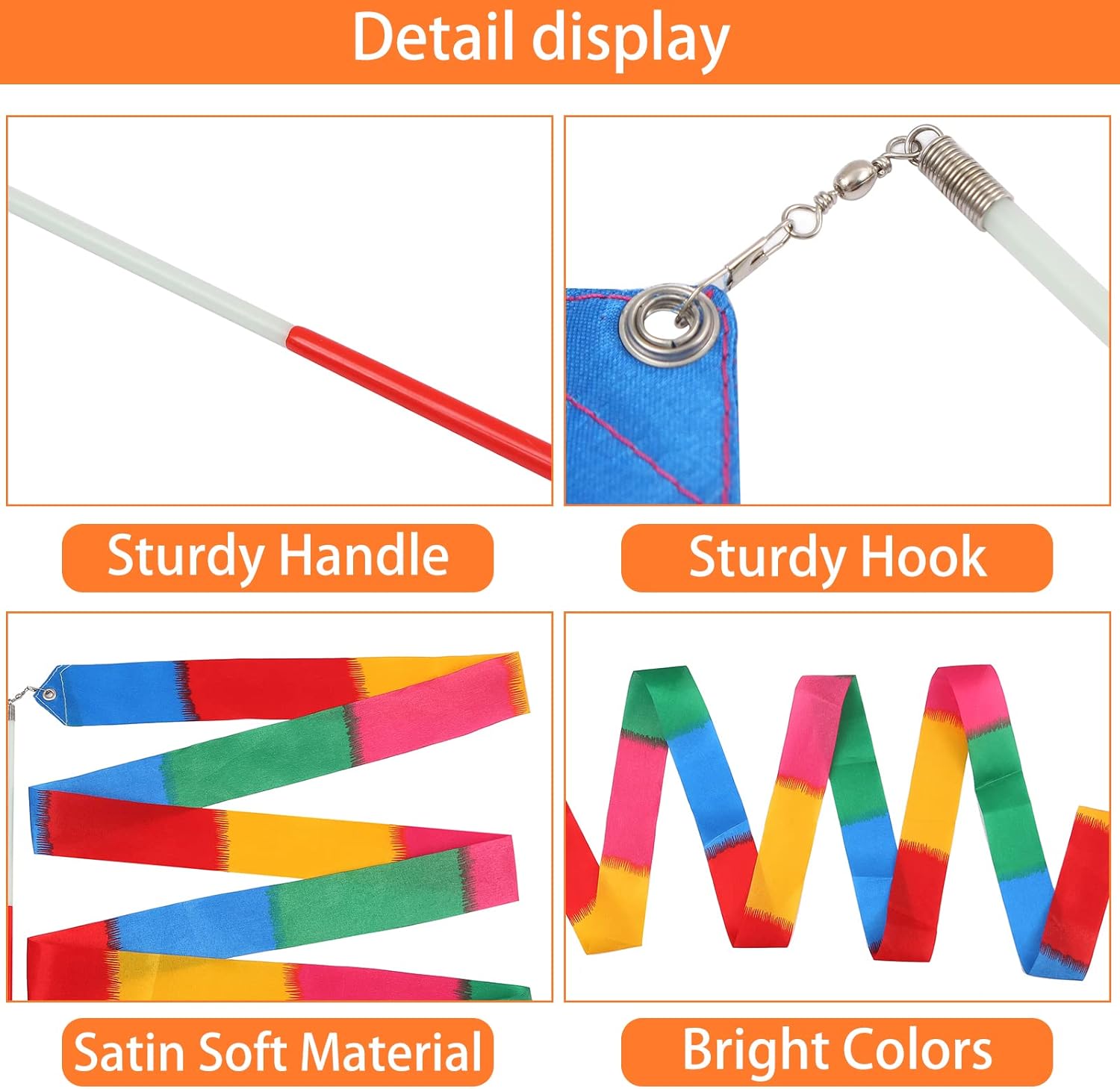 - Quality for Continuous Play - These rainbow wands are made from a soft as silk, flexible, and reflective satin material. The wand handle is 12.2 inches length, ribbon width is 1.77 inches, and ribbon length is 78.7 inches/6.59 ft. The ribbon handles have a sturdy and rugged design that will last through the toughest routines. Whether you are having an outdoor park gathering or indoor game playing, these ribbon wand will always create a stunning display, making every moment more memorable and lively.