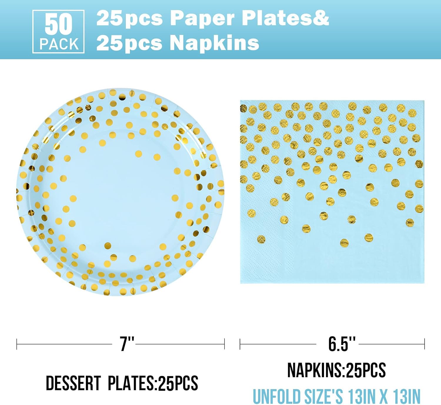 Blue and Gold Paper Plates and Napkins Party Supplies 50 Pack- 25 * 7inch Paper Plates & 25 * 6.5inch Napkins,for Baby Shower,Birthdays Receptions and All Occasions
