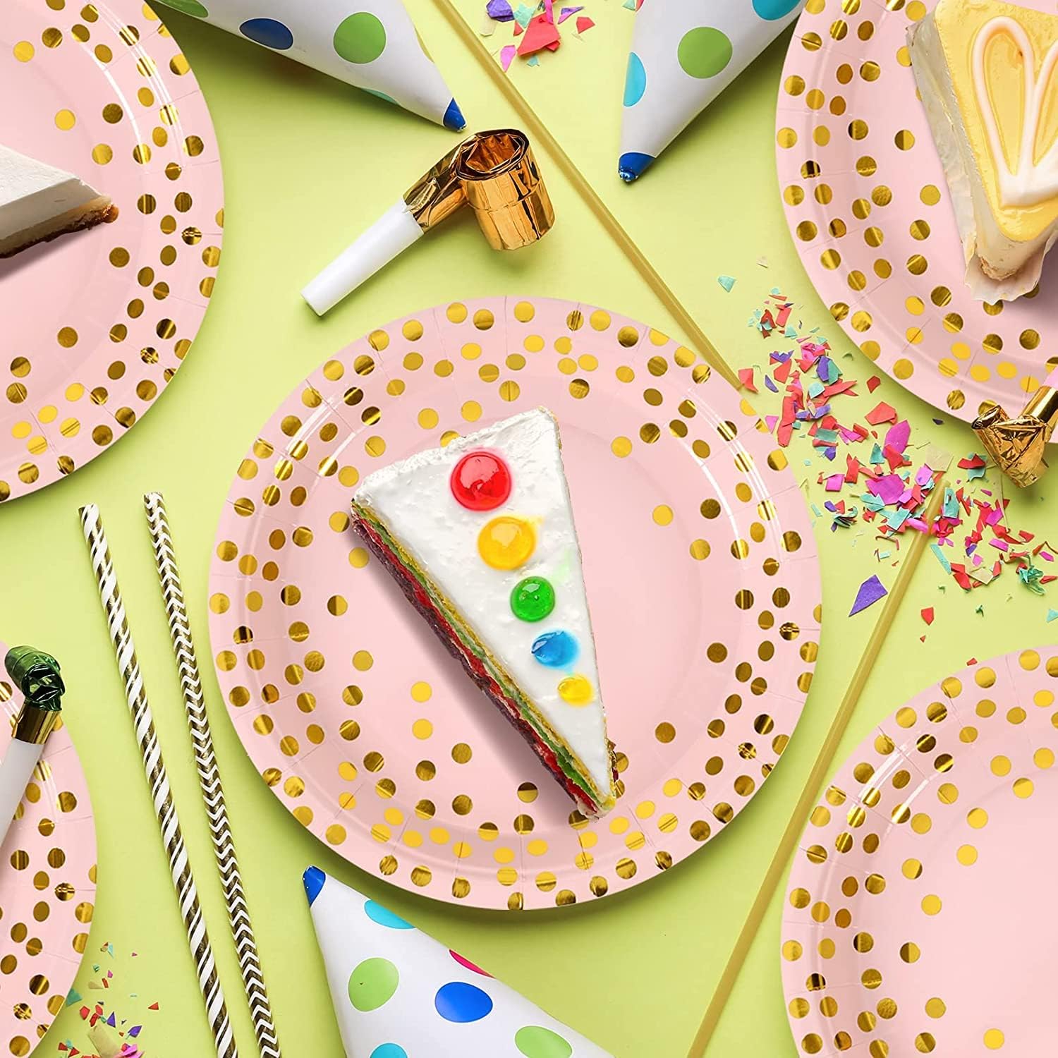 - 2.Gold Foil Polka Dot Design: This party paper plate and napkins is all designed with gold foil polka dots, which is very stylish and beautiful with bright and attractive colors, I believe your guests will really like this design