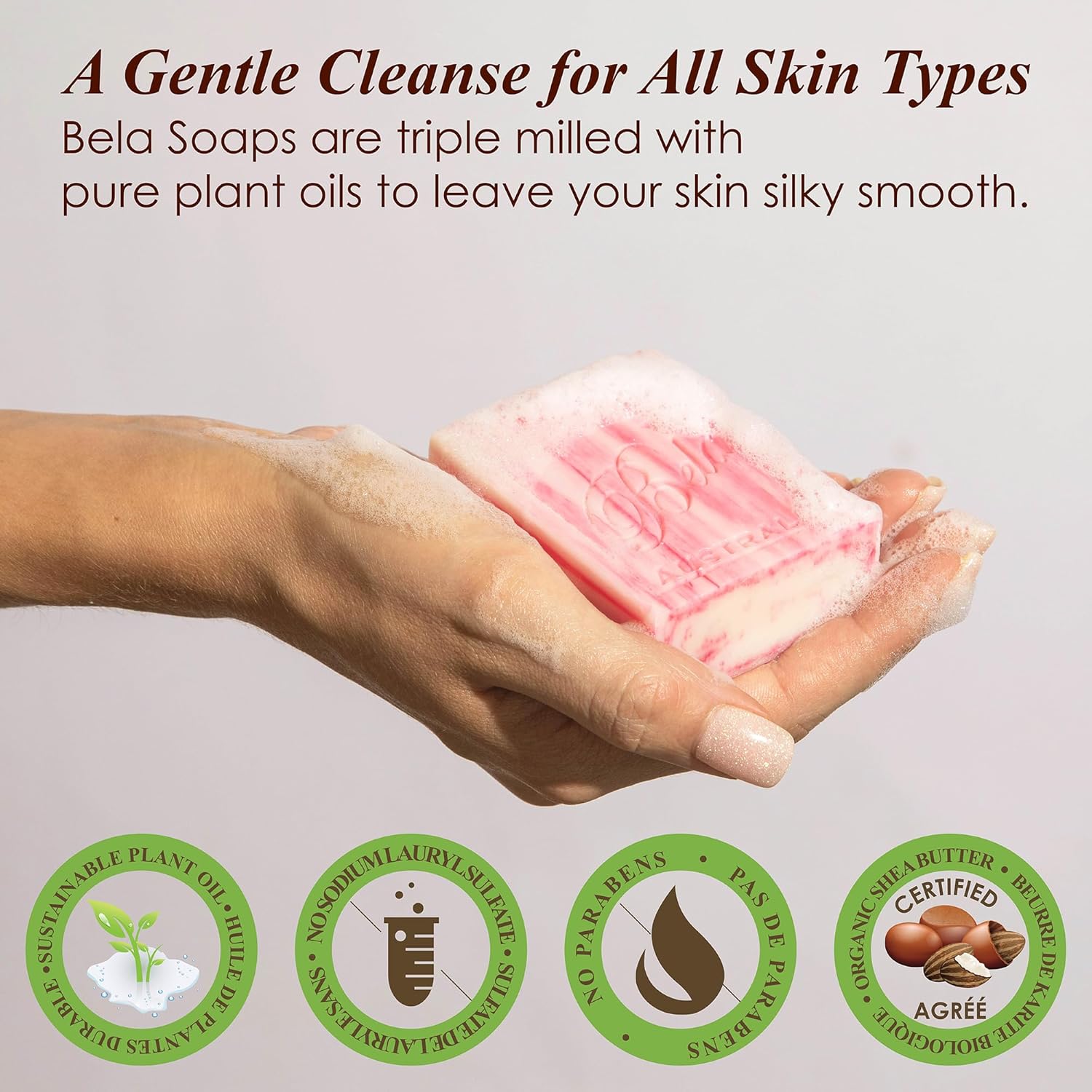 - BELA Soap - Made in Australia: All our soaps are made in Australia with pure ingredients. Our scented shea butter soap bars are gluten free, made with plant oils and do not contain any harsh chemicals or detergents. Treat yourself to an extra special everyday luxury with BELA french bar soap.