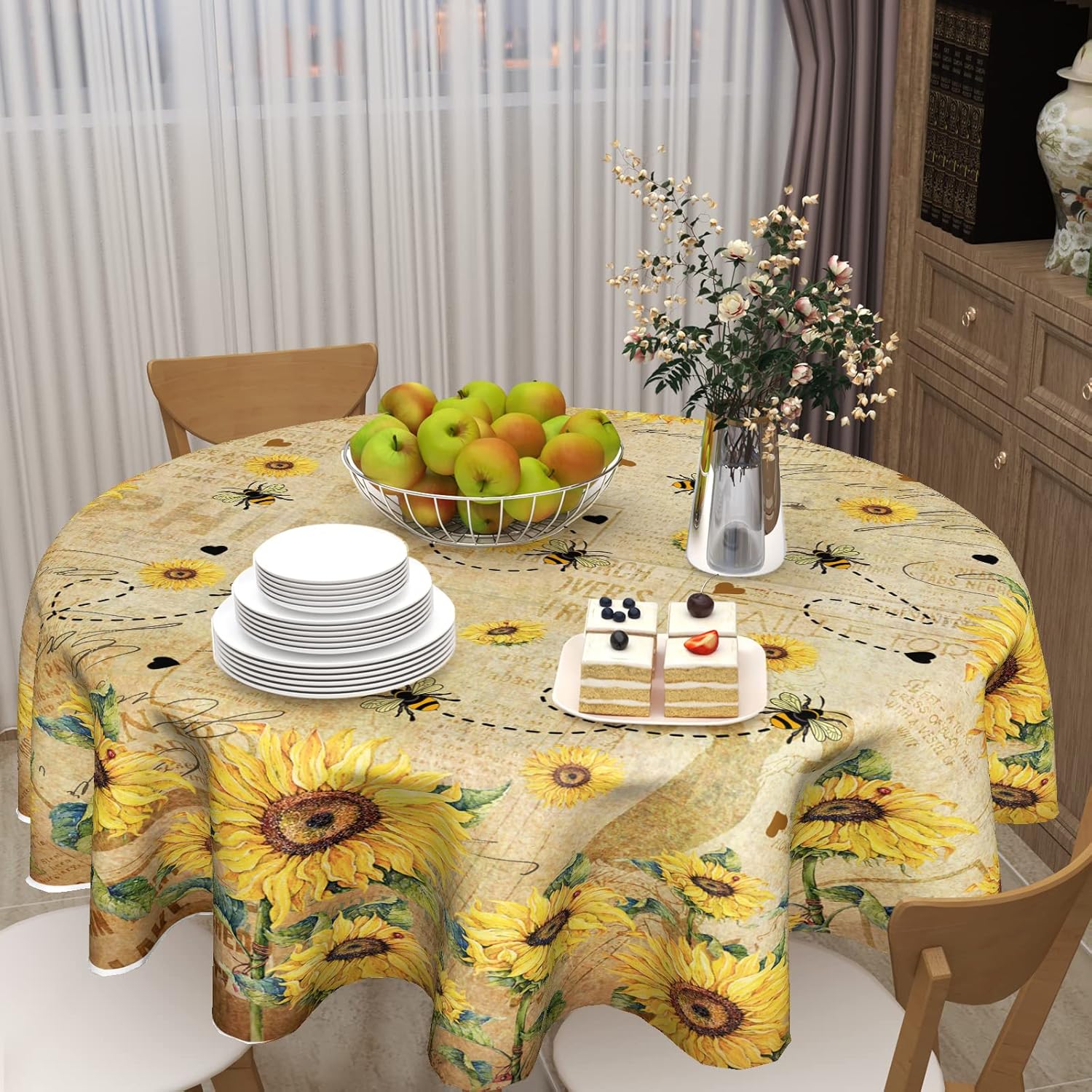 Giwawa Sunflower Bee Round Tablecloth 60inch Yellow Flower Vintage Floral Style Circle Table Cover Wrinkle Free Shabby Chic Cabin Circular Table Cloth Washable for Kitchen Dining Farmhouse Decor