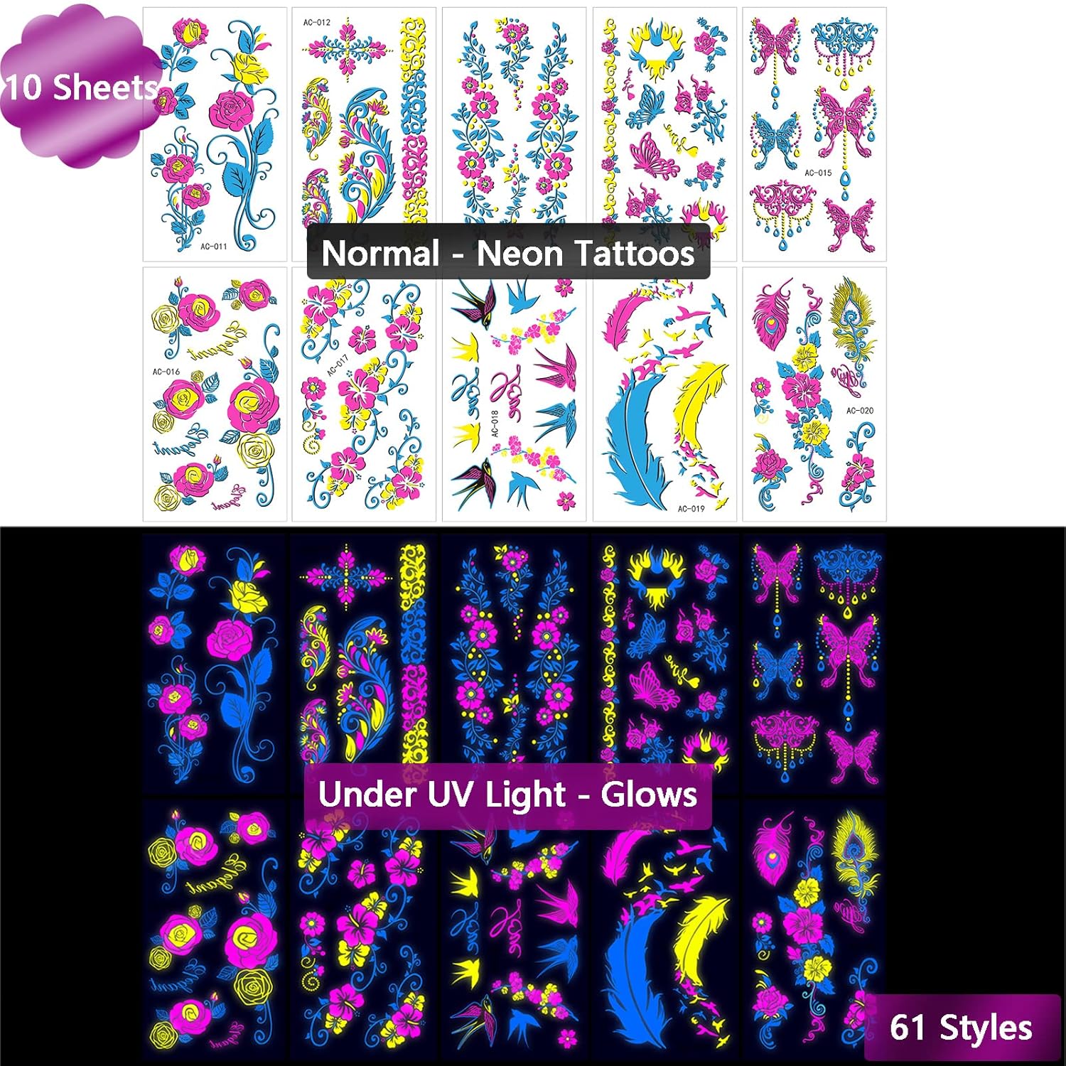 - More Styles: 10 sheets neon tattoos stickers, 61 styles including dazzling flowers butterflies, feathers, swallows and more.