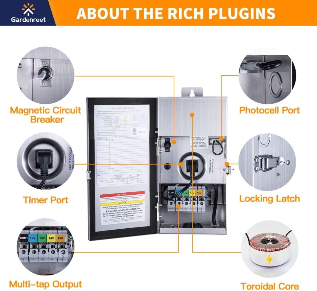 - Professional Grade Design - The 150 watt low-voltage transformer adopts a multi-tab output design of (12V/13V/14V/15V). The 304 stainless steel metal casing is sealed to prevent rainwater from entering, allowing you to use it without worrying about its lifespan. The 100ft 14/2 AWG electrical wire uses high-precision, oxygen-free copper with low resistance and good conductivity, allowing your lights to be used in a farther location without worrying about voltage drop or overheating issues.
