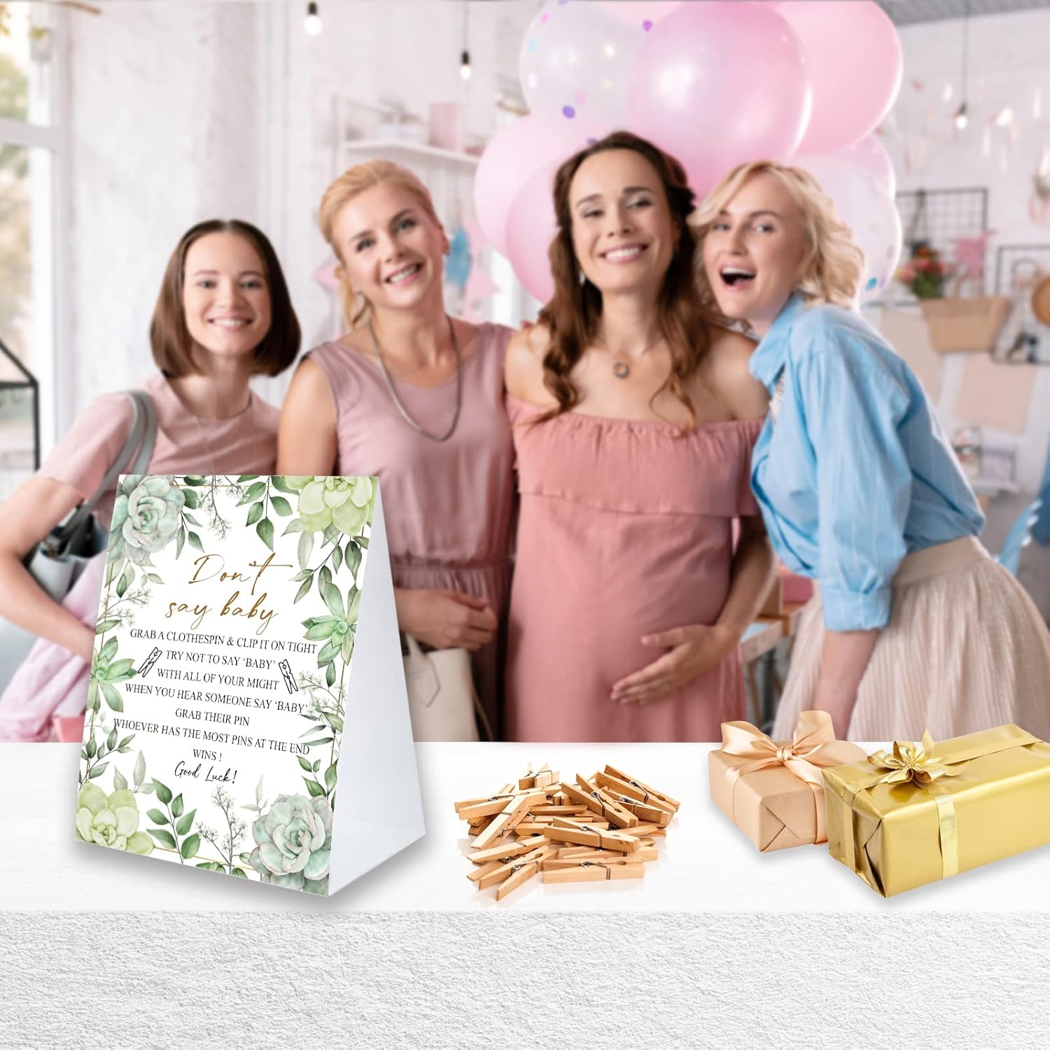 Don't Say Baby Game For Baby Shower Clothespin Game, One 5x7 Coated Paper Sign And 50 Natural Clothespins, Succulent Theme, Gender Neutral -NDSBB28