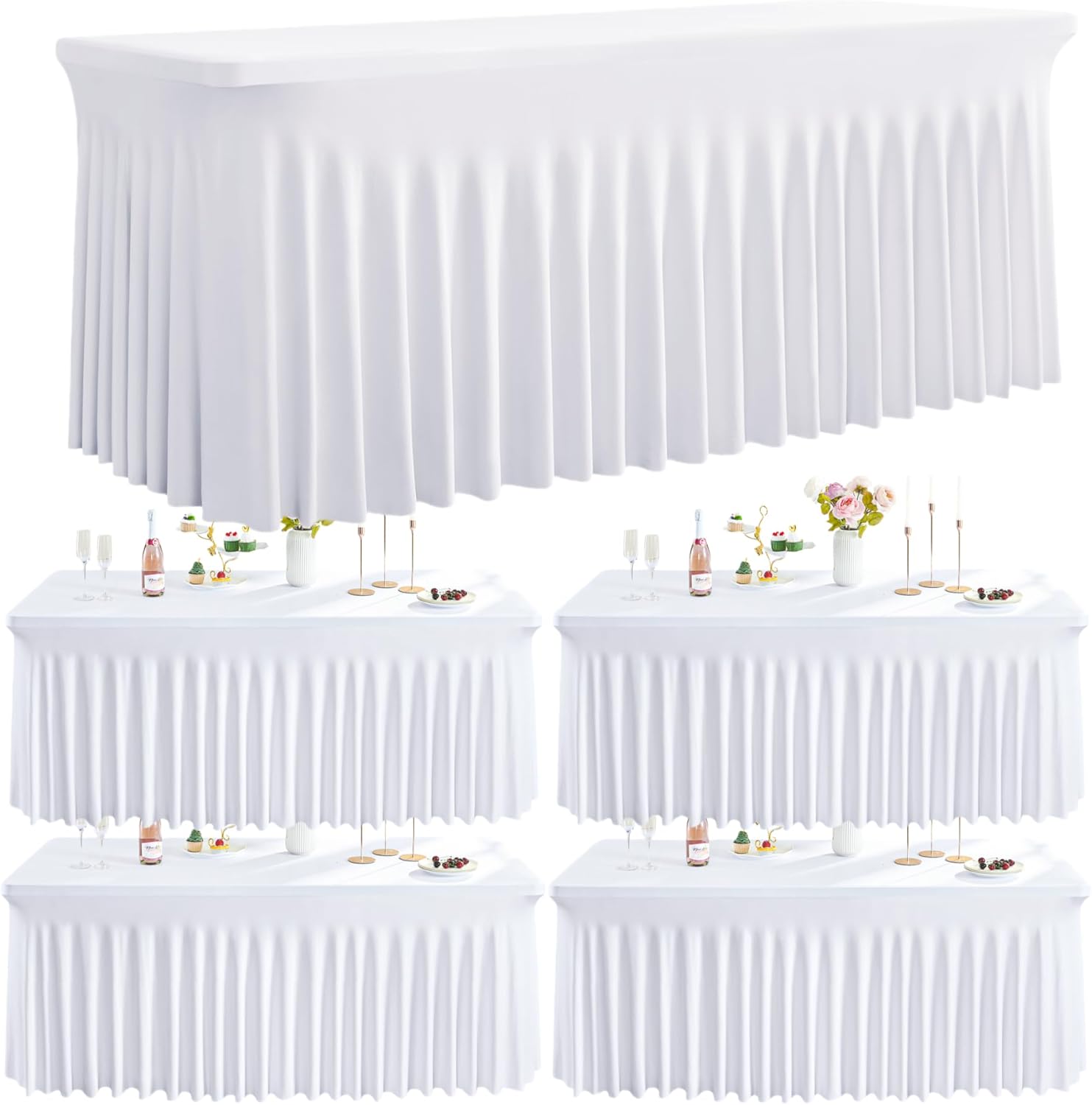 Outpain White Spandex Table Clothes for 6 Foot Rectangle Tables-4Pack 6FT Spandex Fitted Table Cover, Wrinkle Free Tablecloths with Skirt for Parties, Wedding, Birthday, Banquet, Festival
