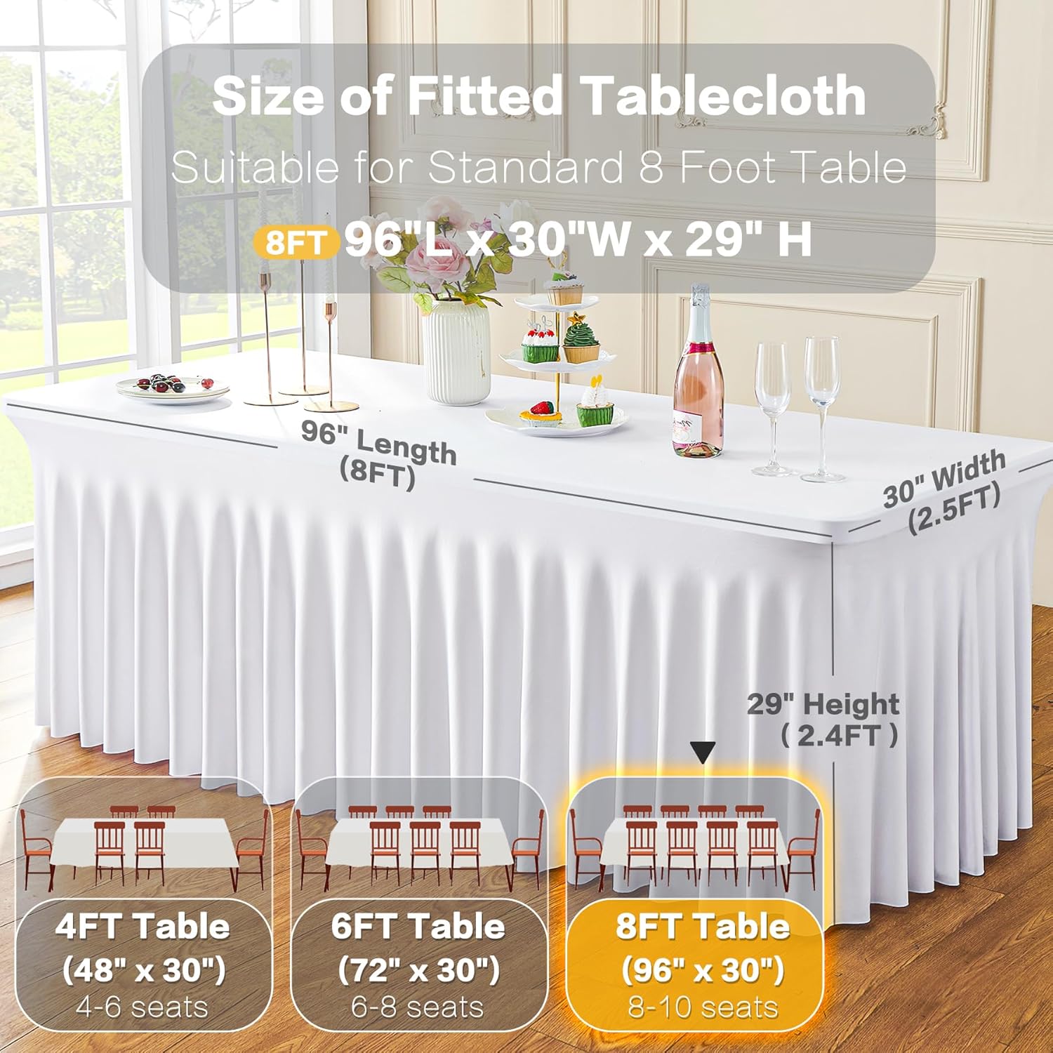 - 1. You will receive 2 Pack white stretchy spandex tablecloths with skirt fitted for 8 foot rectangle table. Manteles de mesa de tela para fiestas.