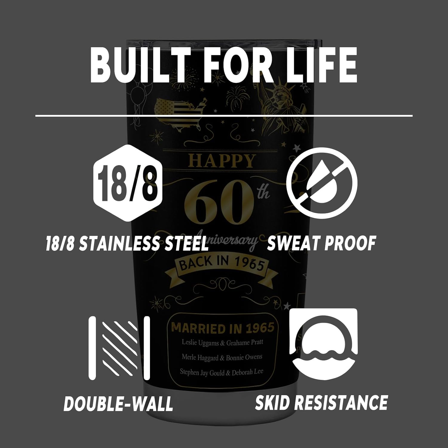 Happy 60th Anniversary Wedding Gifts for Men Women 60th Anniversary Tumbler 60 Years Wedding Gifts for Couple Wife Husband Back in 1965 Stainless Steel Vacuum Insulated Tumbler 20 oz