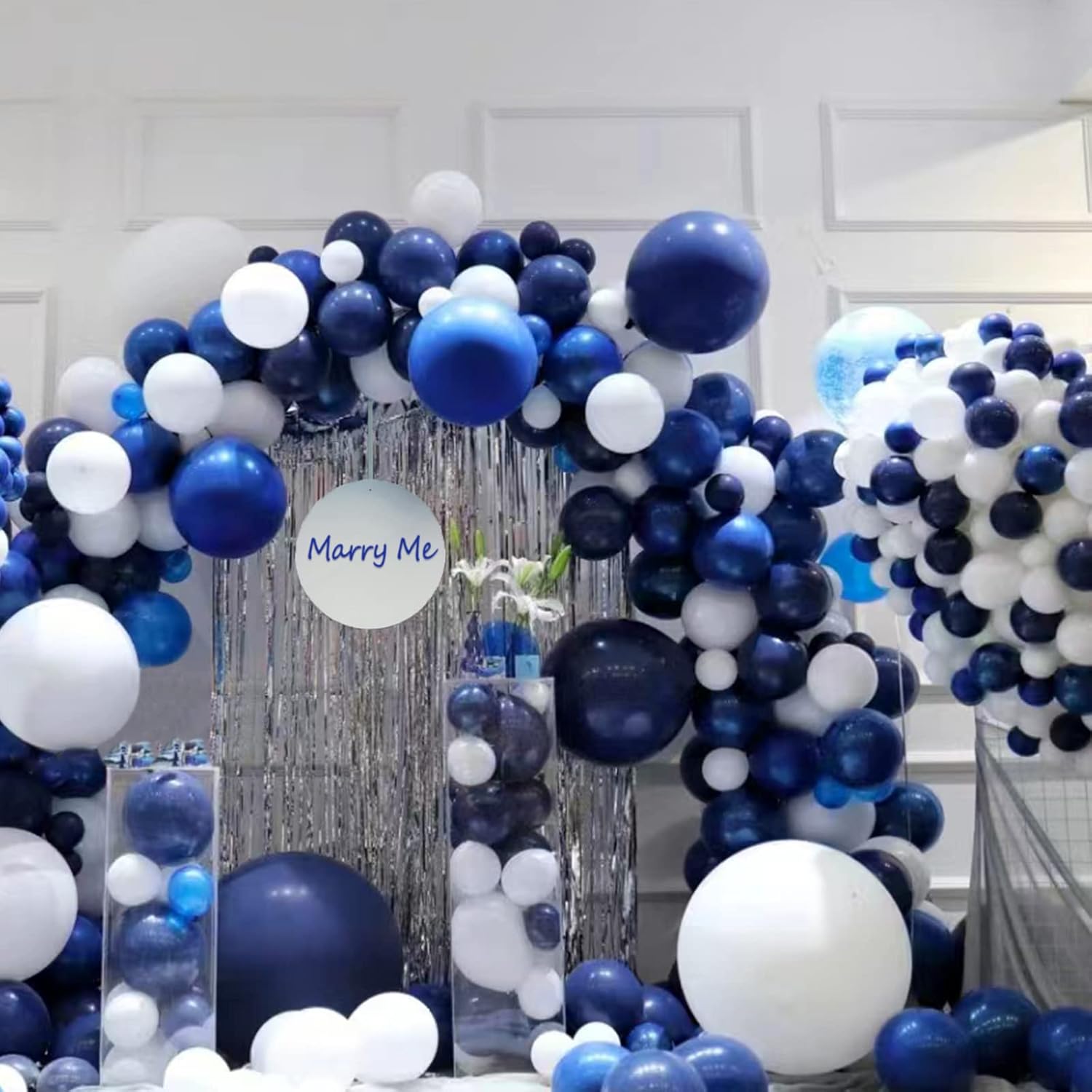 - Our balloon garland kit Included 134pcs navy blue latex Balloons: 18inch 4pcs, 12inch 35pcs, 10inch 35pcs, 5inch 60pcs and 1glue, 1 ribbon, 1 balloon chain. navy blue balloons in different sizes Can meet your different party needs.