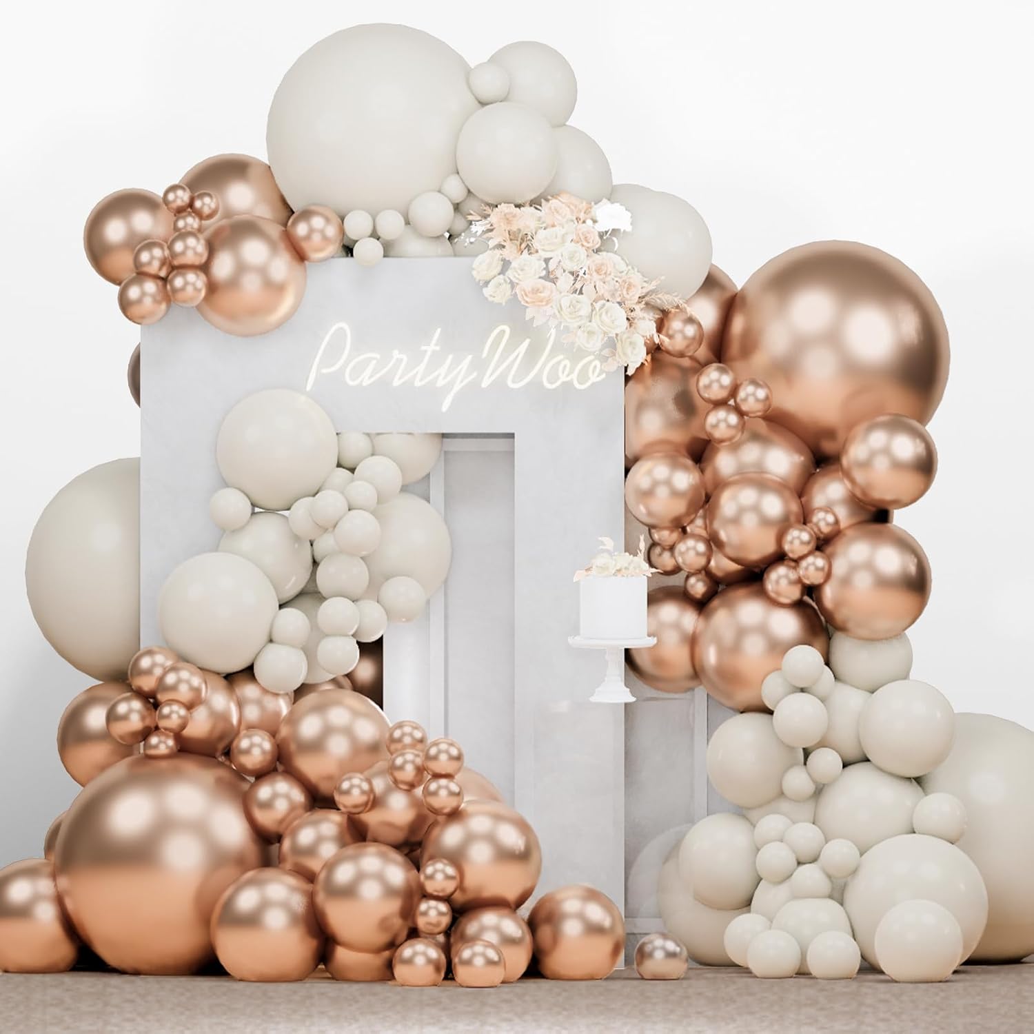 - 140 pcs WHITE SAND AND CHAMPAGNE GOLD BALLOONS DIFFERENT SIZES: Package includes 18 inch balloons 5 pcs, 12 inch balloons 45 pcs, 10 inch balloons 20 pcs, 5 inch small balloons 70 pcs, balloon decorating strip included
