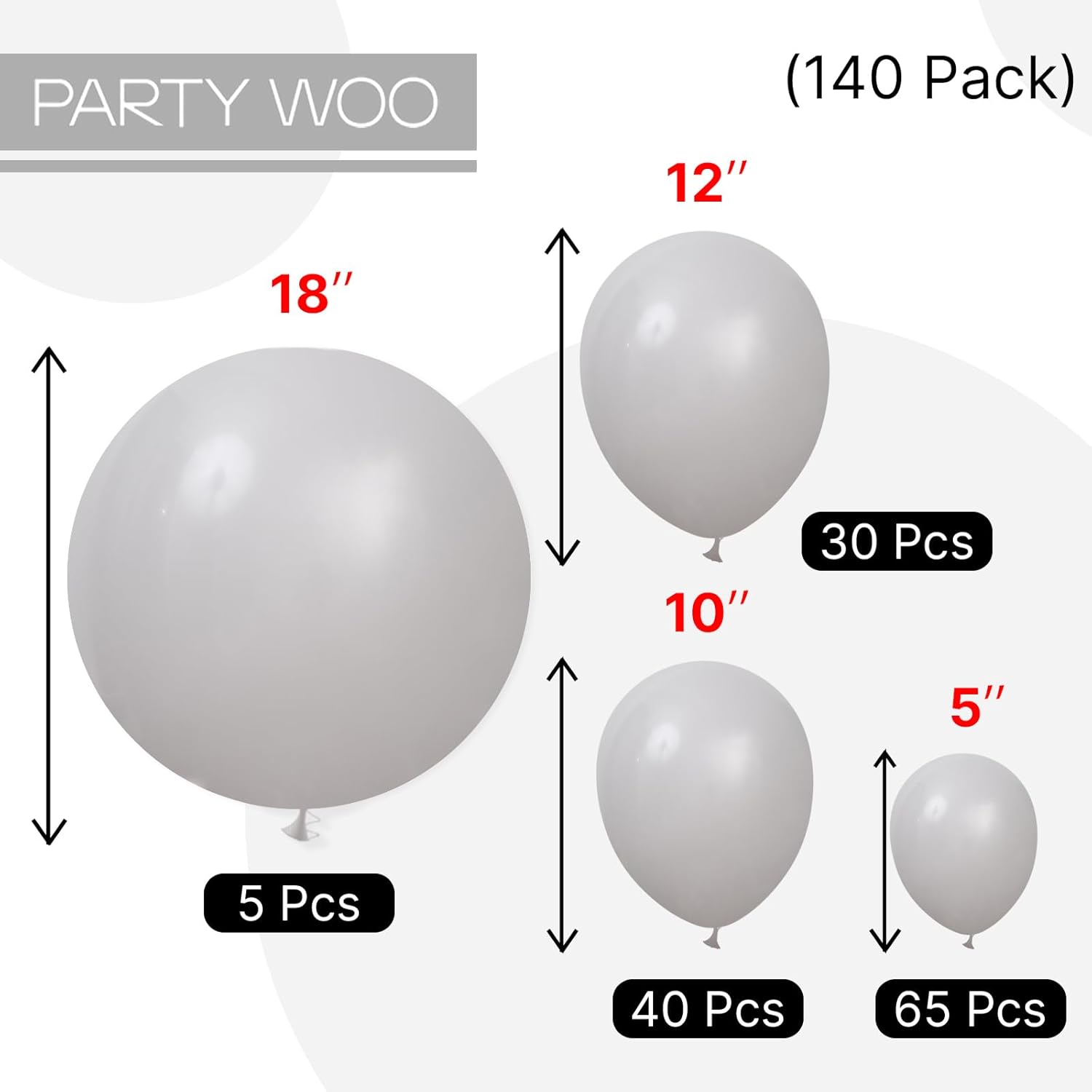 PartyWoo Gray Balloons 140pcs Different Sizes Pack of 18 12 10 5 Inch Matte Gray Latex Balloon Arch Kit for Baby Shower Graduation Wedding Anniversary Birthday Party Decorations Gray-Y71