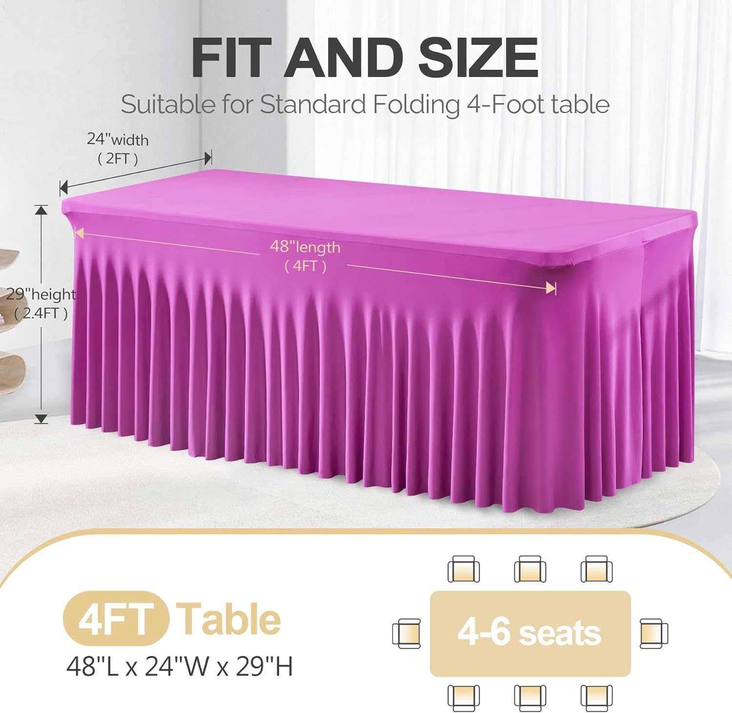 - ⭐ Spandex Table Covers for 4 Foot Tables: This ruffle table skirts fitted tablecloths for 4 foot rectangle tables (that is 48 "L X 24 "W X 29 "H) . Made of silky smooth stretchy wrinkle resistant material, sturdy reusable and lightweight , it’s makes your table or products look elegant t and professional.