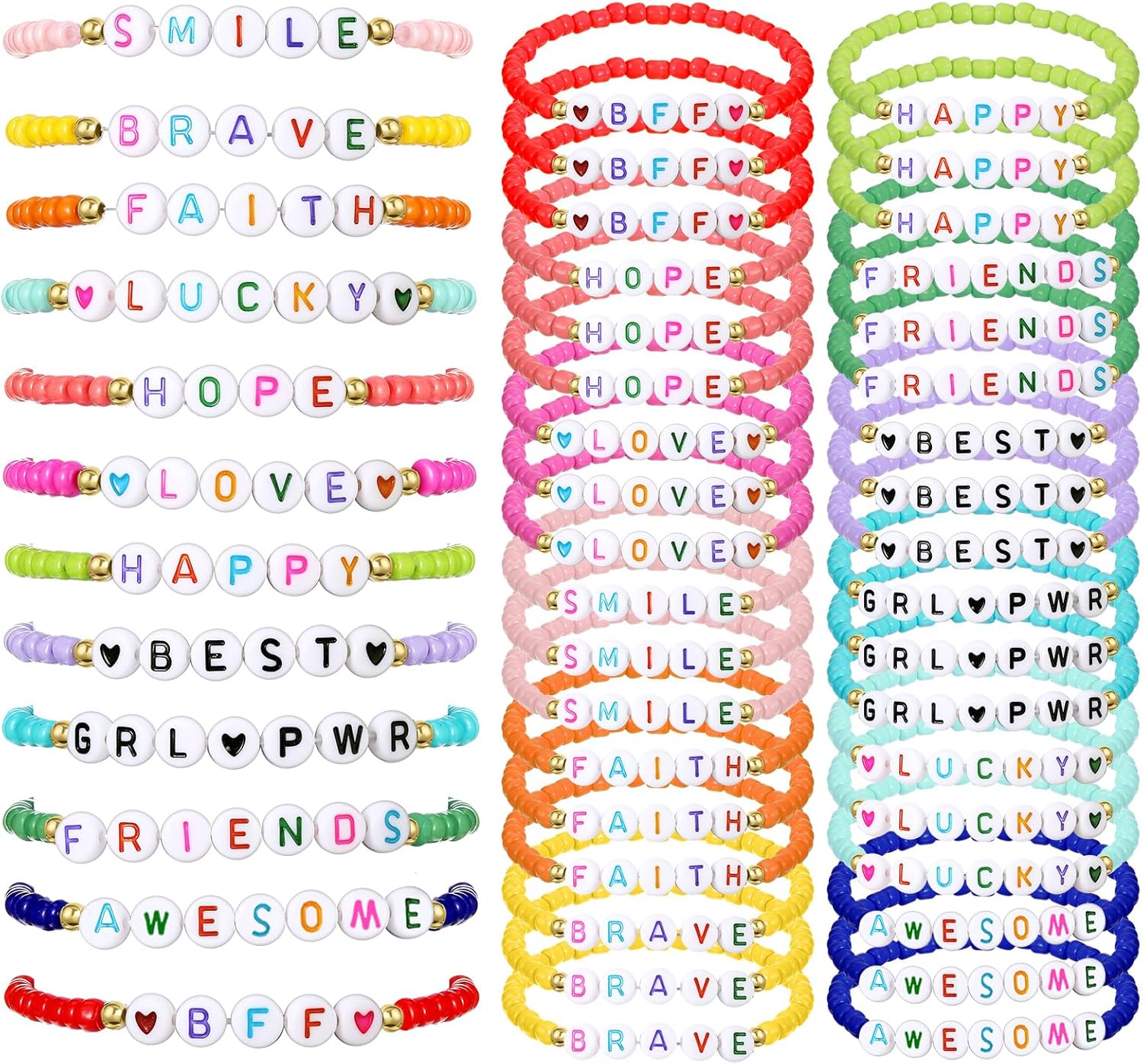 - Cute Designs: there are 12 kinds of letters designs among those rave bracelets, such as [smile], [lucky], [believe], [hope], [happy], [dream], [friends], and more, meaningful words and colorful beads making them eye catching for you and your kids