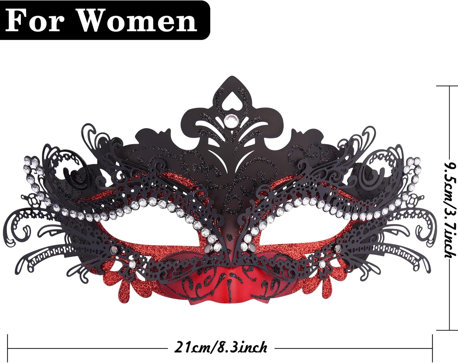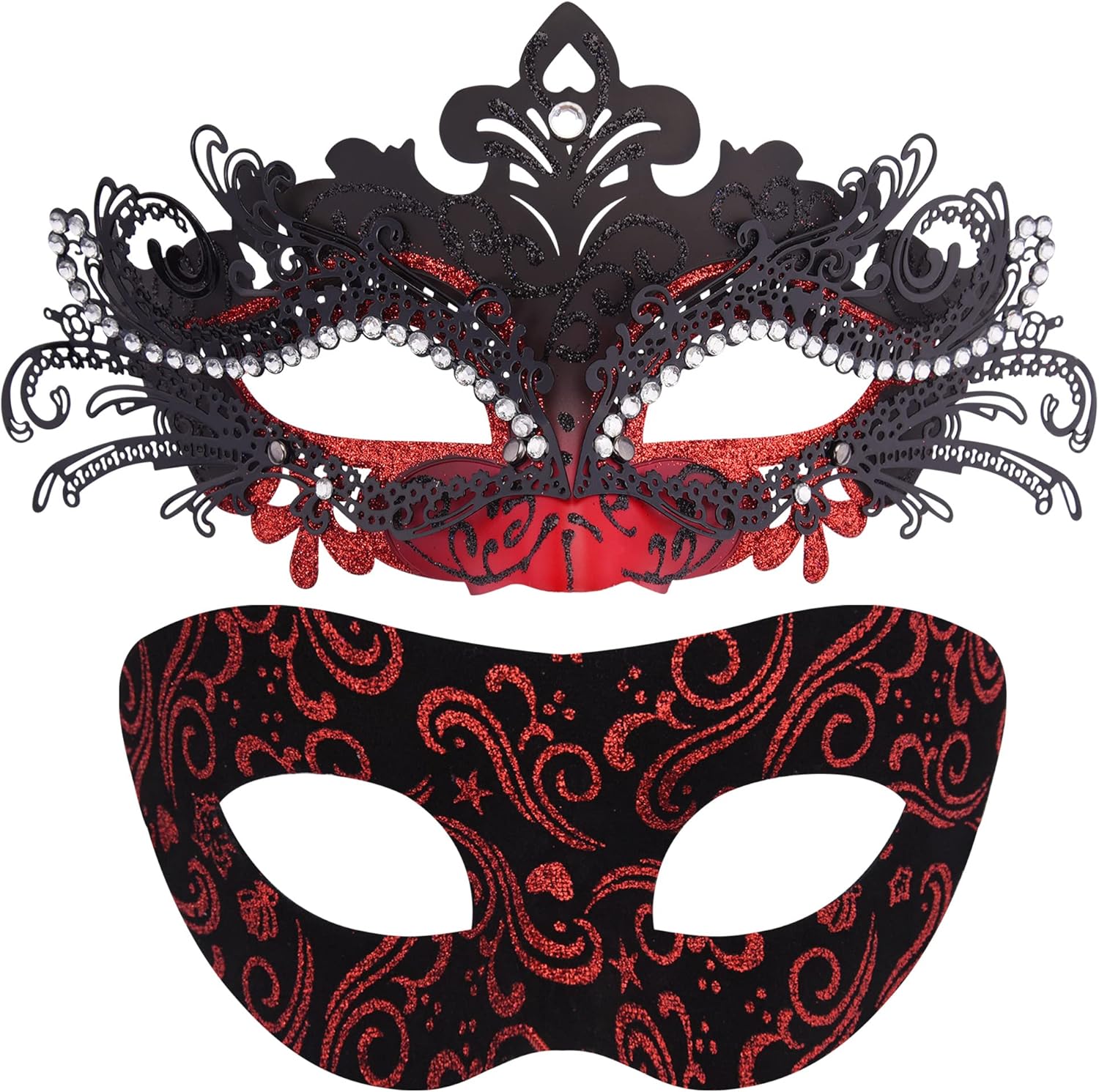 - Package includes - 2 pcs masquerade masks for couples, the black base with red pattern masquerade mask for men, the black ABS base inlaid with red alloy masquerade mask for women with rhinestones