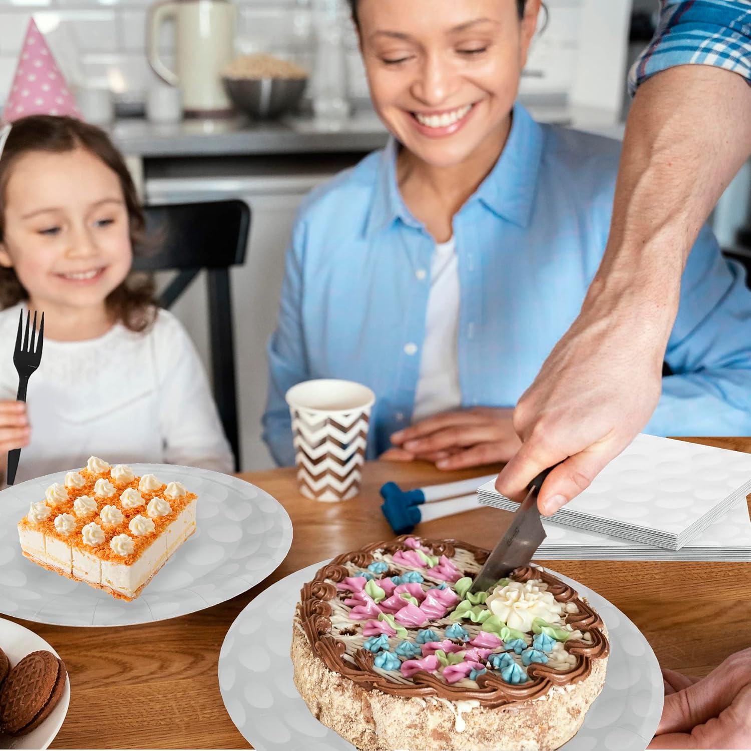 - This bundle comes with everything you need to serve up to 30 guests – 30 9-inch dinner plates, 30 7-inch dessert plates, 30 6.5 inch napkins and 30 forks. All items are made from premium quality paper, so they’re durable and easy to dispose of. The classic grey and white color scheme will match any décor and give your event an air of sophistication.
