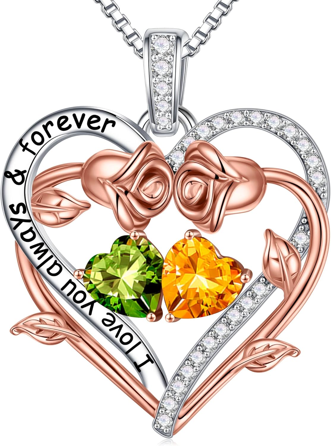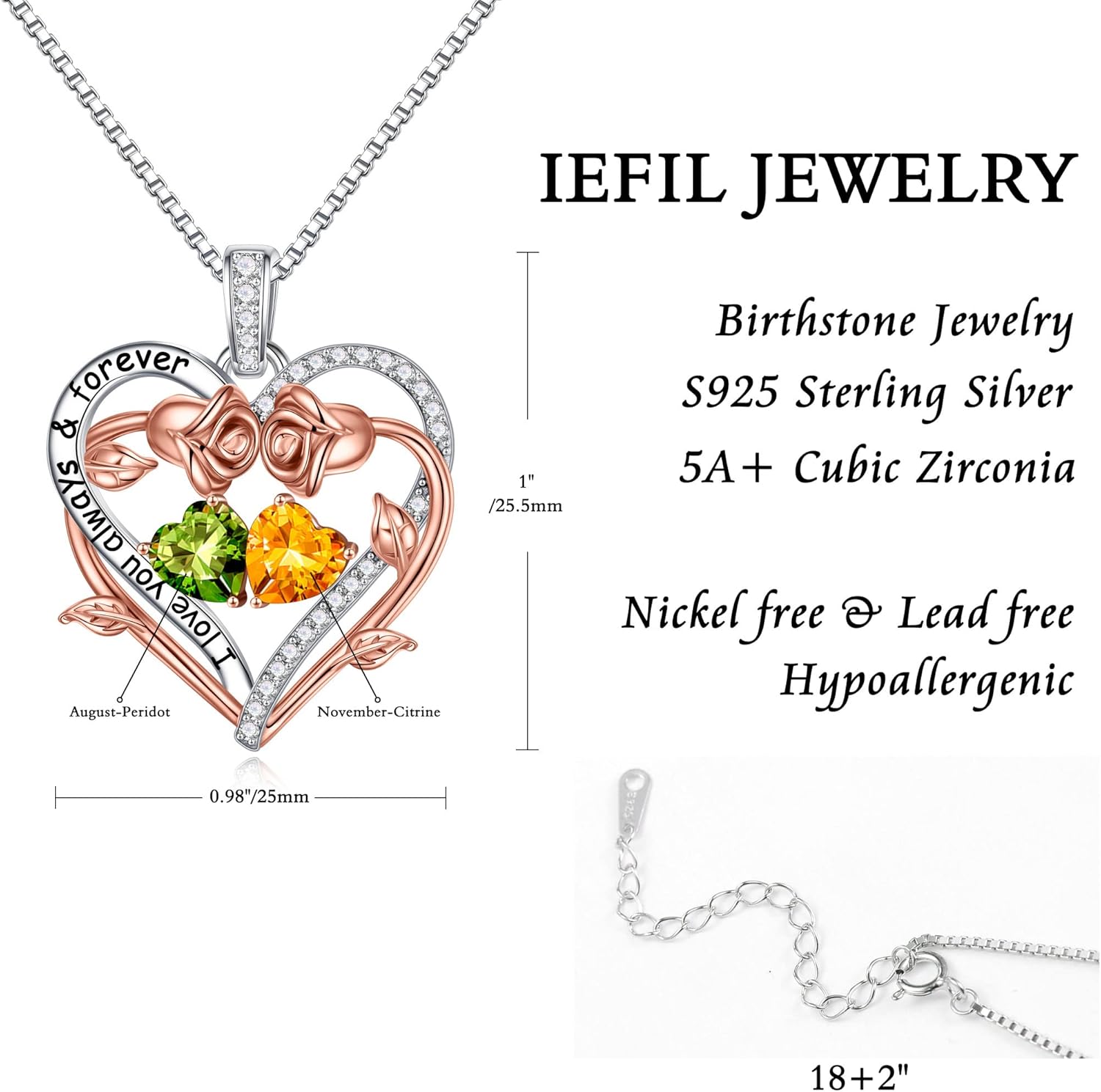 Iefil Rose Heart Double Birthstone Necklace Gifts for Wife Her Mom Women, Birthstone Jewelry Gemstone Birthday Gifts for Girlfriend Grandma Her Wife Women