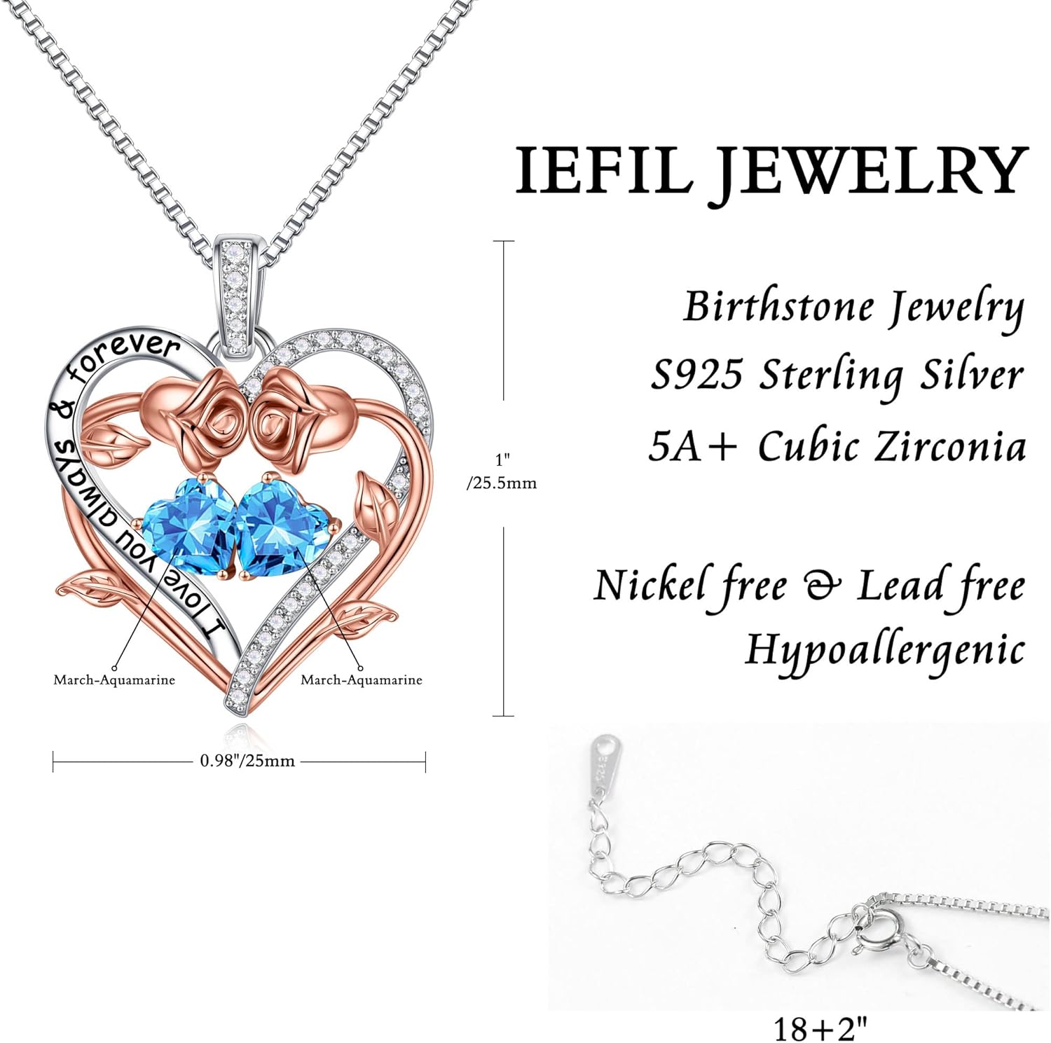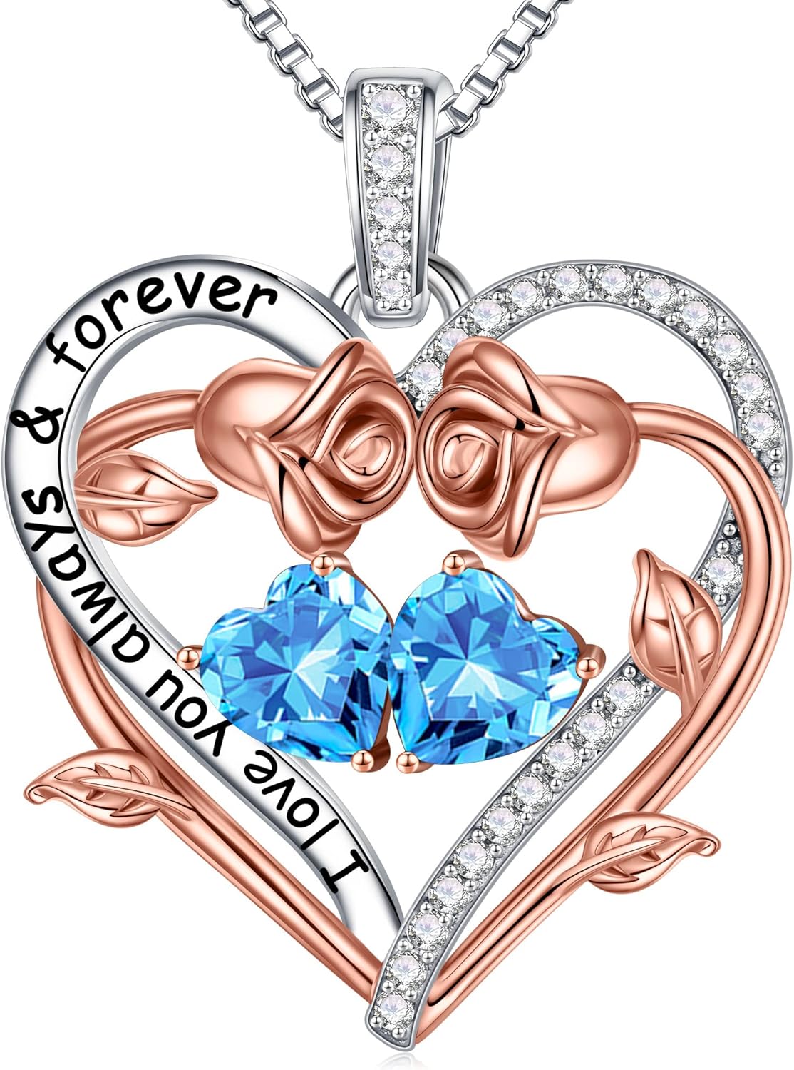 Iefil Rose Heart Double Birthstone Necklace Gifts for Wife Her Mom Women, Birthstone Jewelry Gemstone Birthday Gifts for Girlfriend Grandma Her Wife Women