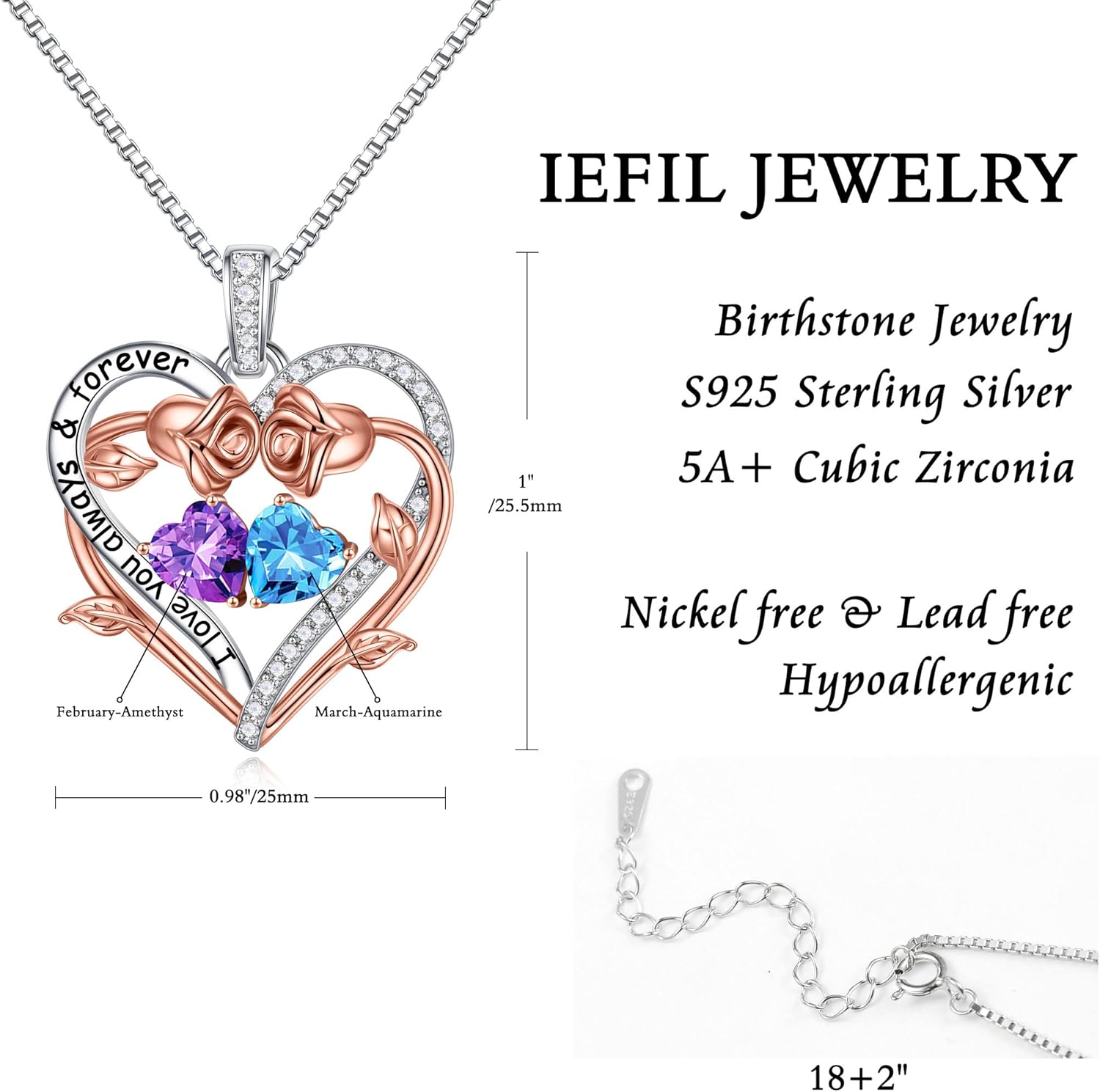 Iefil Rose Heart Double Birthstone Necklace Gifts for Wife Her Mom Women, Birthstone Jewelry Gemstone Birthday Gifts for Girlfriend Grandma Her Wife Women