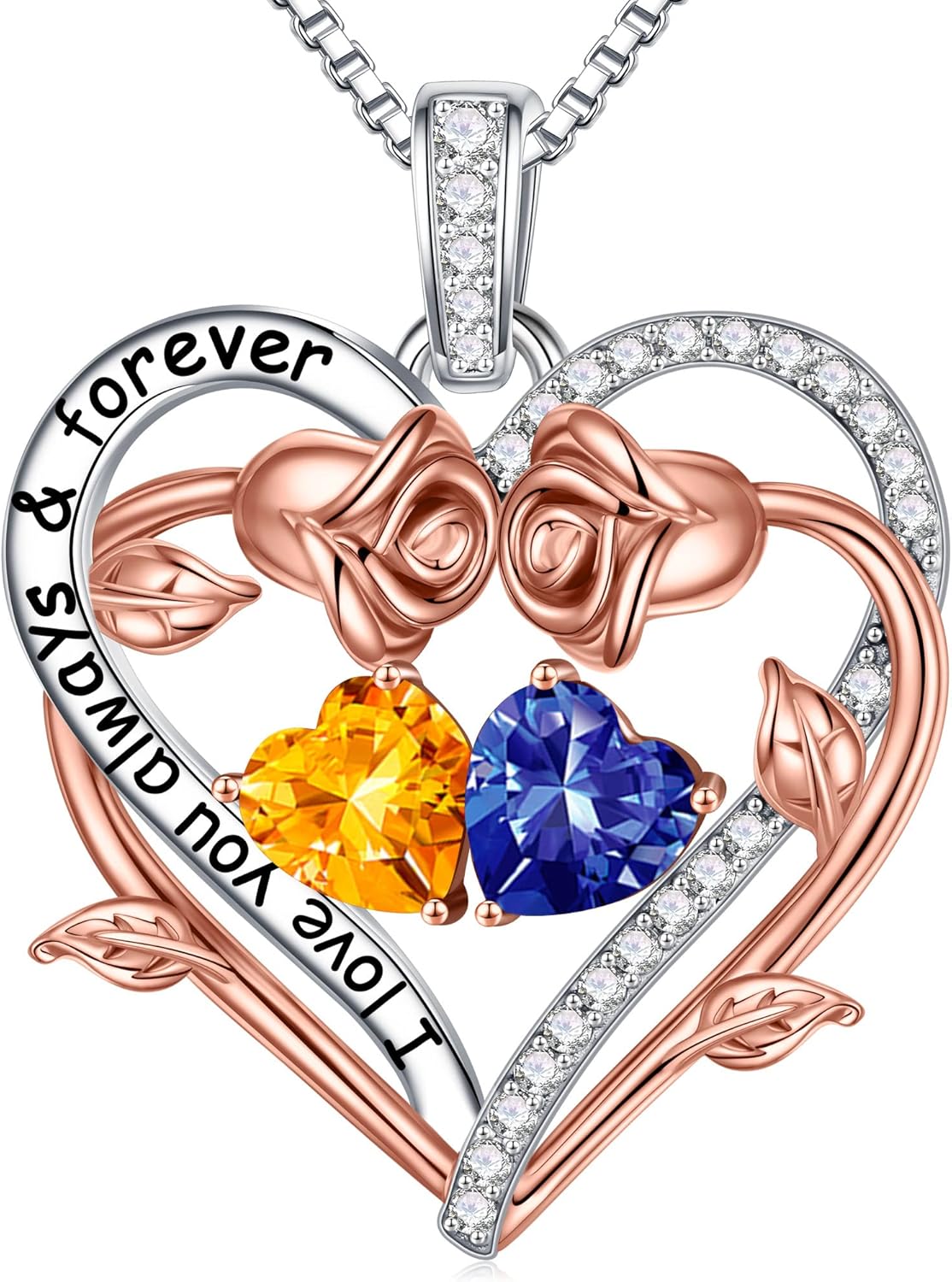 Iefil Rose Heart Double Birthstone Necklace Gifts for Wife Her Mom Women, Birthstone Jewelry Gemstone Birthday Gifts for Girlfriend Grandma Her Wife Women
