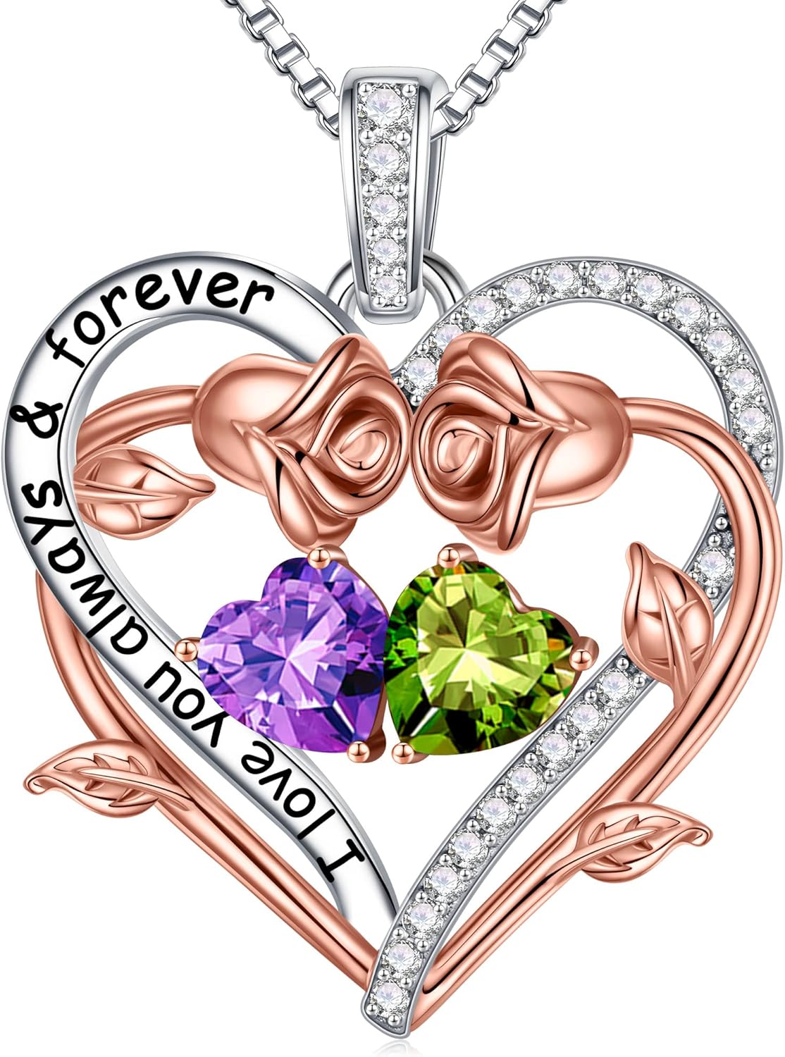 Iefil Rose Heart Double Birthstone Necklace Gifts for Wife Her Mom Women, Birthstone Jewelry Gemstone Birthday Gifts for Girlfriend Grandma Her Wife Women