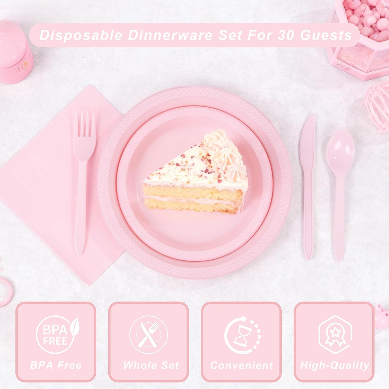 WELLIFE 210Pcs Pink Plastic Plates,Disposable Dinnerware Set,Party Supplies Including Pink plates, 12oz Cups, plastic Cutlery and Napkins Serve 30 Guests