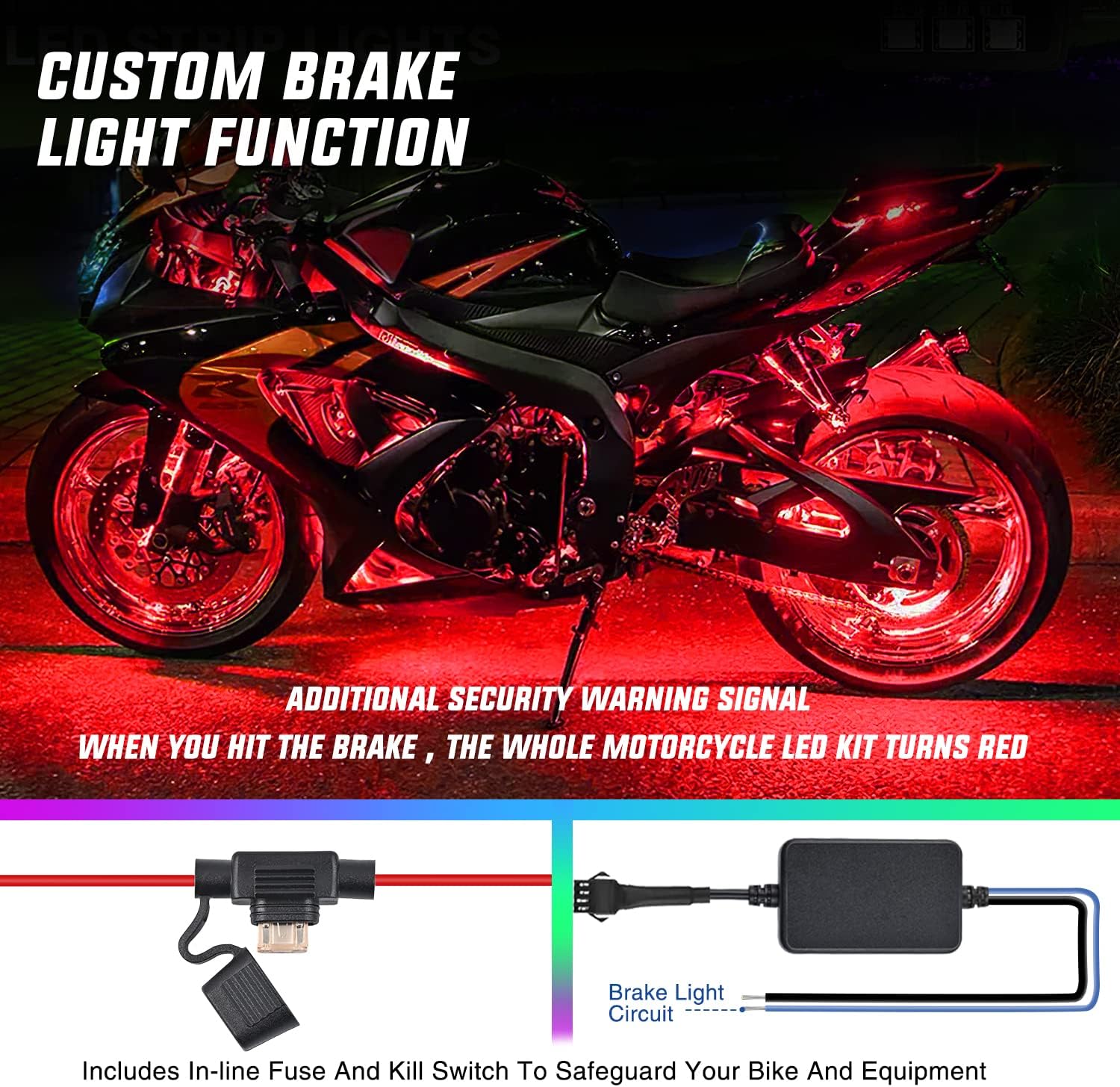 - Brake Light Function & Music Mode: When you hit the brake, the whole motorcycle led kit turns red to send out a security warning signal. Effectively improve your driver safety. Turn on the music, the LED Chips will dance and flash with the music. Various modes can be switched at will, give you an amazing visual and auditory experience