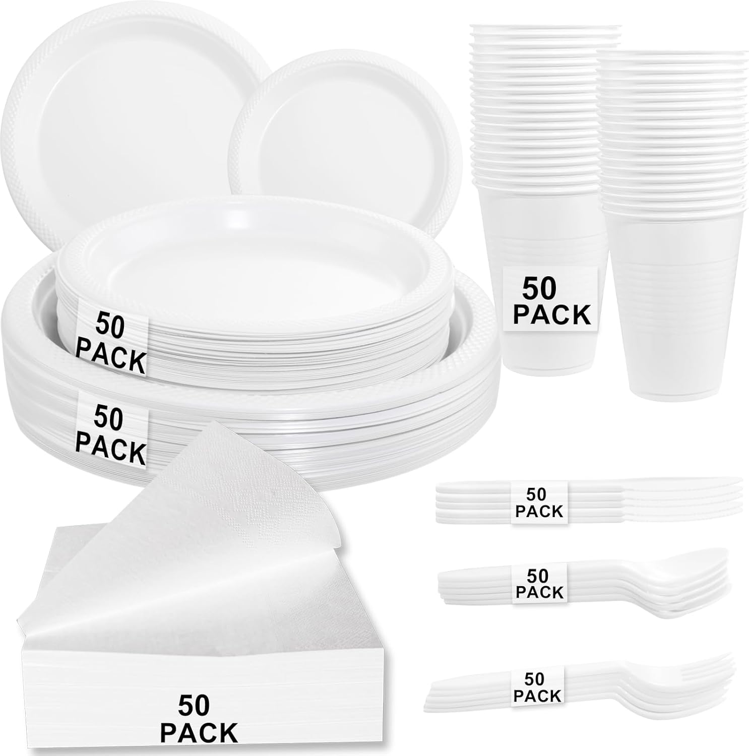 - VALUE PACK:Our white disposable plates set can serve up to 50 guests, the white party supplies set contains 50pcs 9'' dinner plates, 50pcs 7'' dessert plates, 50pcs plastic knives, 50pcs plastic forks, 50pcs plastic spoons, 50pcs white napkins, 50pcs 16oz plastic cups.