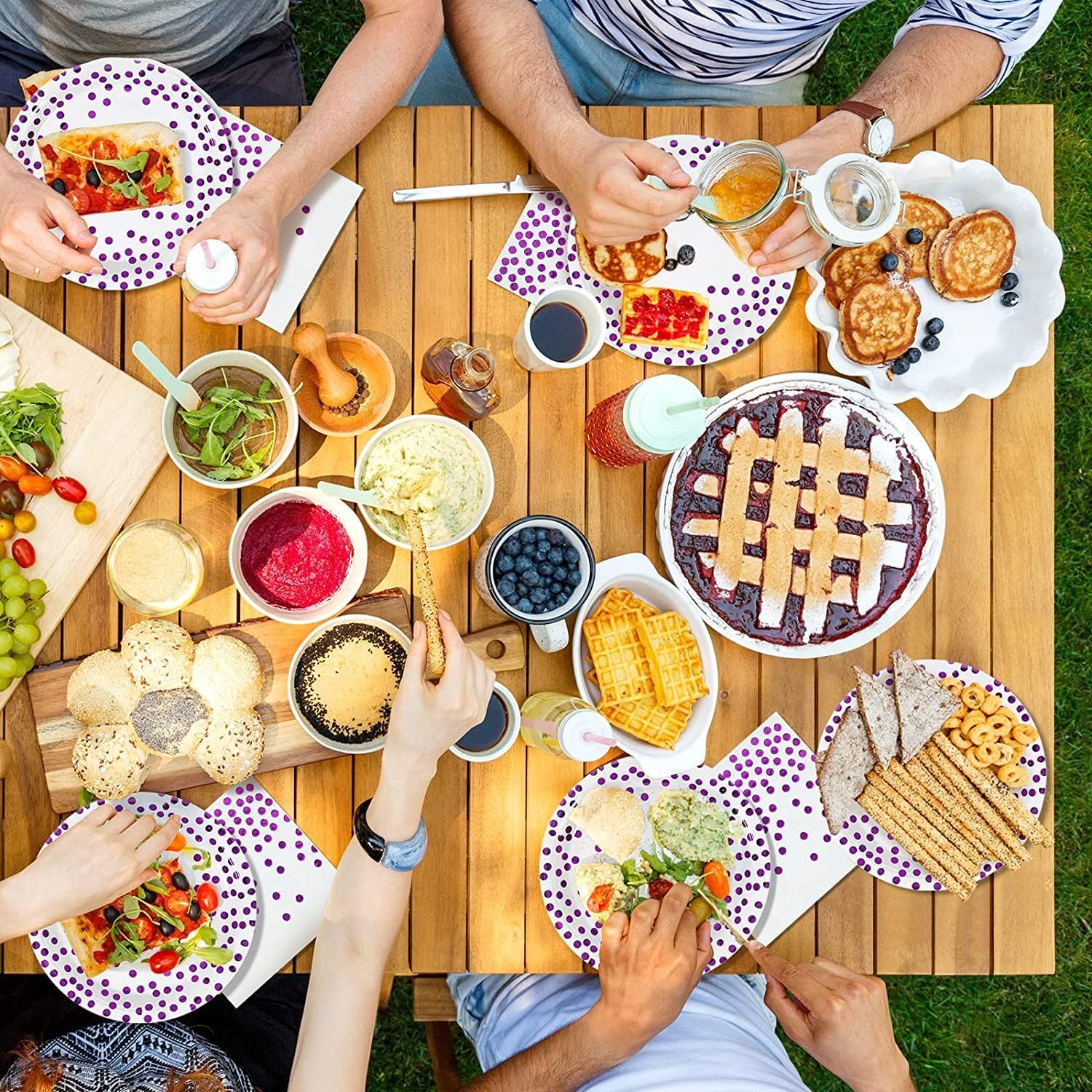 - 4.【Save Your Time】:With our white purple paper plates and napkins just bring your foods and you'll have a fabulous party!Disposable party supplies can help you get rid of any messy your tables,throw they away after use, no need to worry about environmental protection and cleaning, and at the same time enjoy the decoration they add to your party and the compliments they get