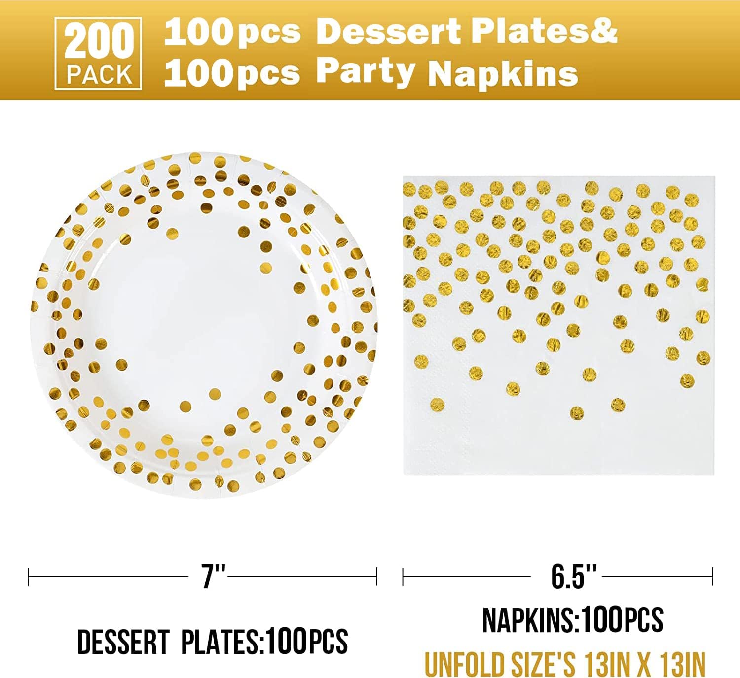 White and Gold Plates and Napkins -100 x 7inch Paper Plates & 100 x 6.5inch Napkins,White Paper Plate for Cake,Dessert,Great for Weddings,Birthdays,Bridal Parties,All Occasions(200 PCS)