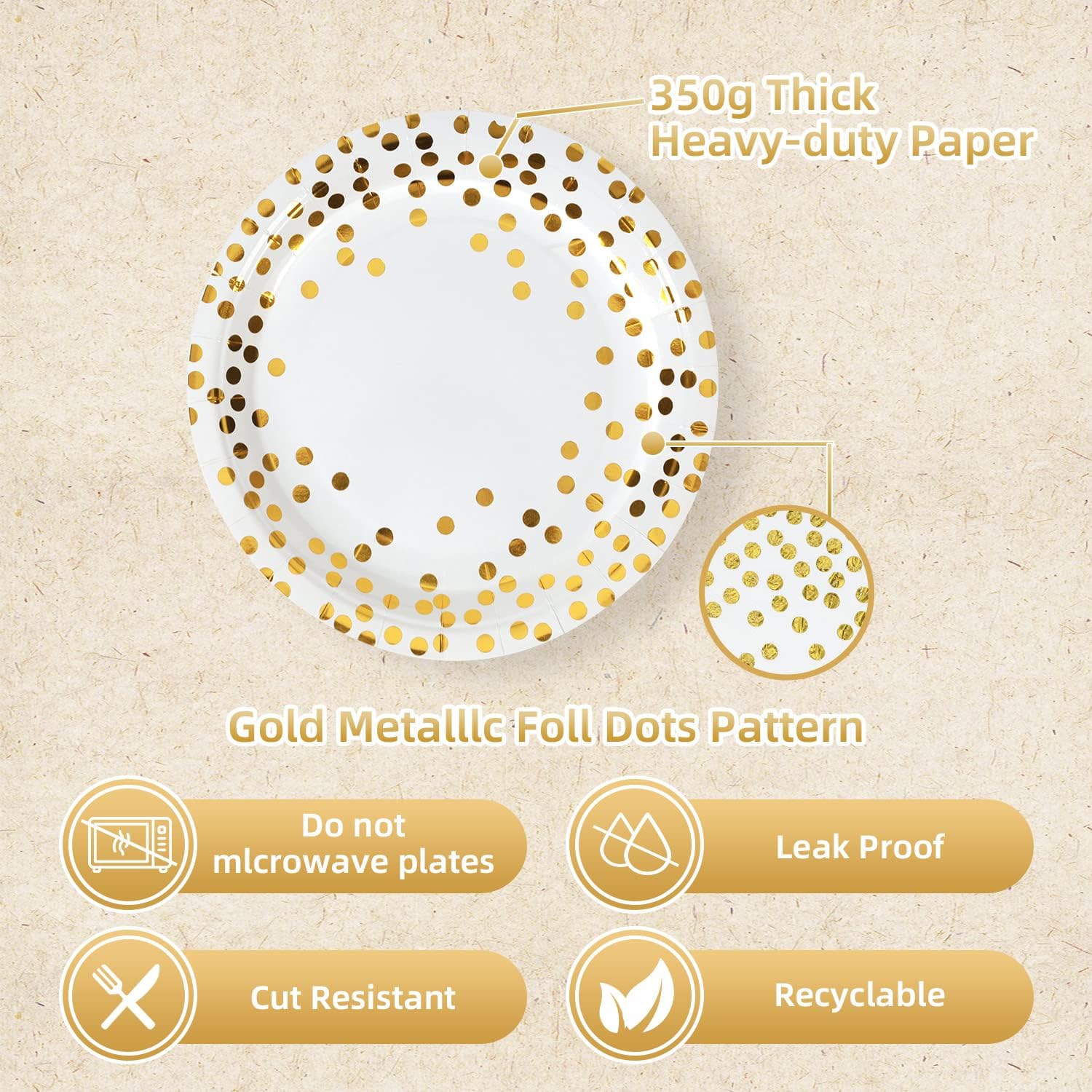 - 2.【Foil Polka Dot Design】:These white and gold party paper plates and napkins are all designed with gold foil polka dots,which is very stylish and beautiful with bright and attractive colors,everyone will like this elegant design,and have a good time!NOTE:Please don't microwave the plates and napkins